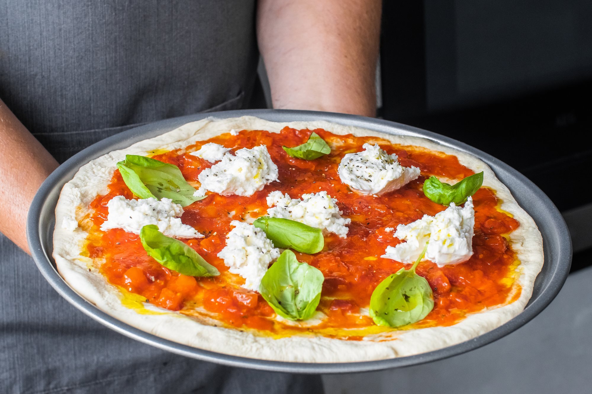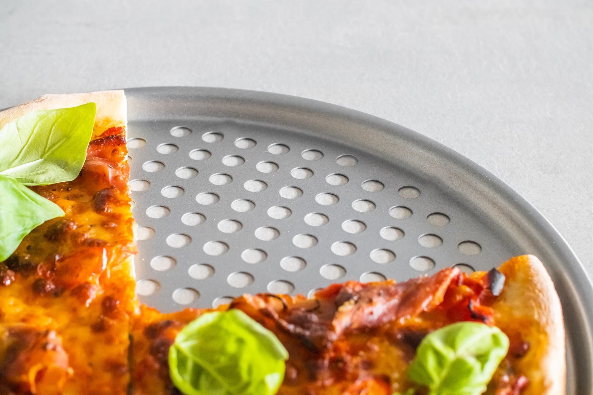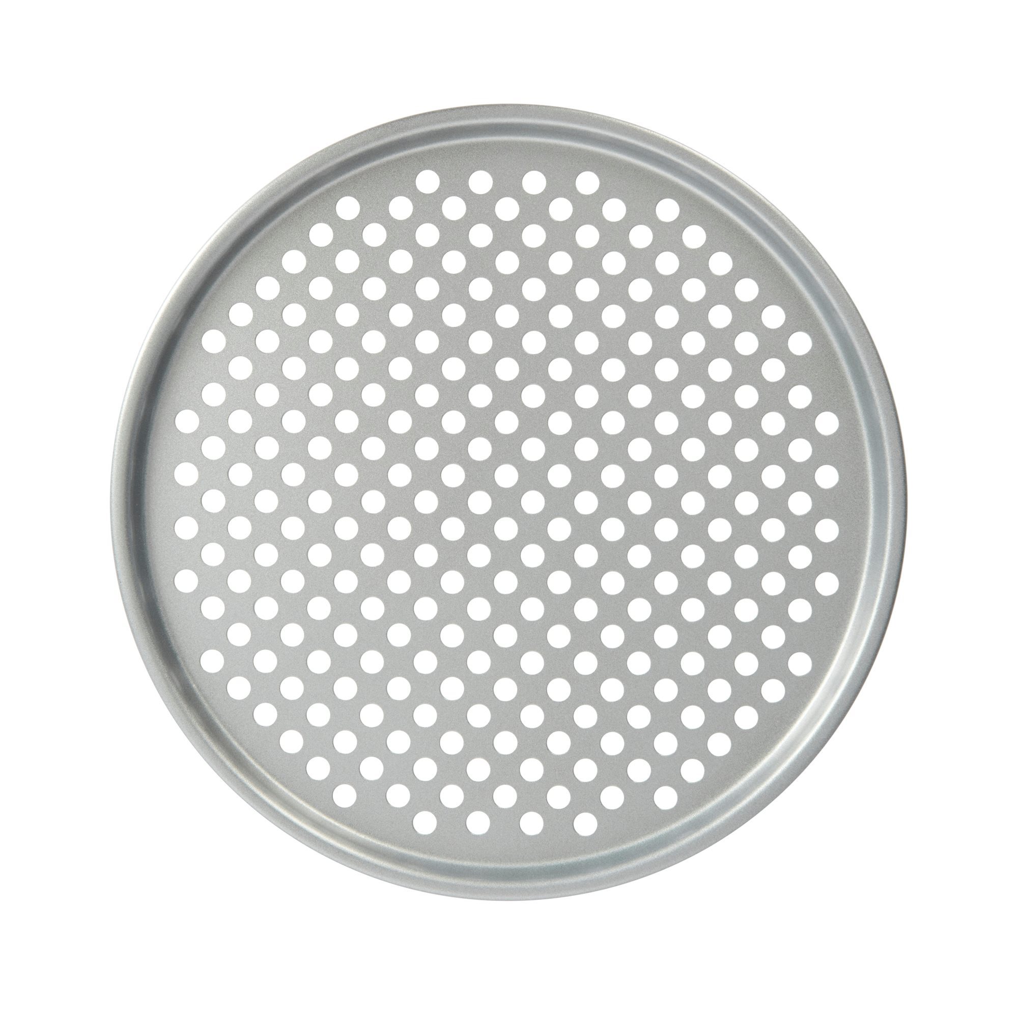 Rundt pizzabrett, diameter 33 cm, laget av Kitchen Craft, ideelt for å tilberede en sprø pizza. Brettet har lufteåpninger som bidrar til å bake pizza- eller chipsdeigen effektivt.