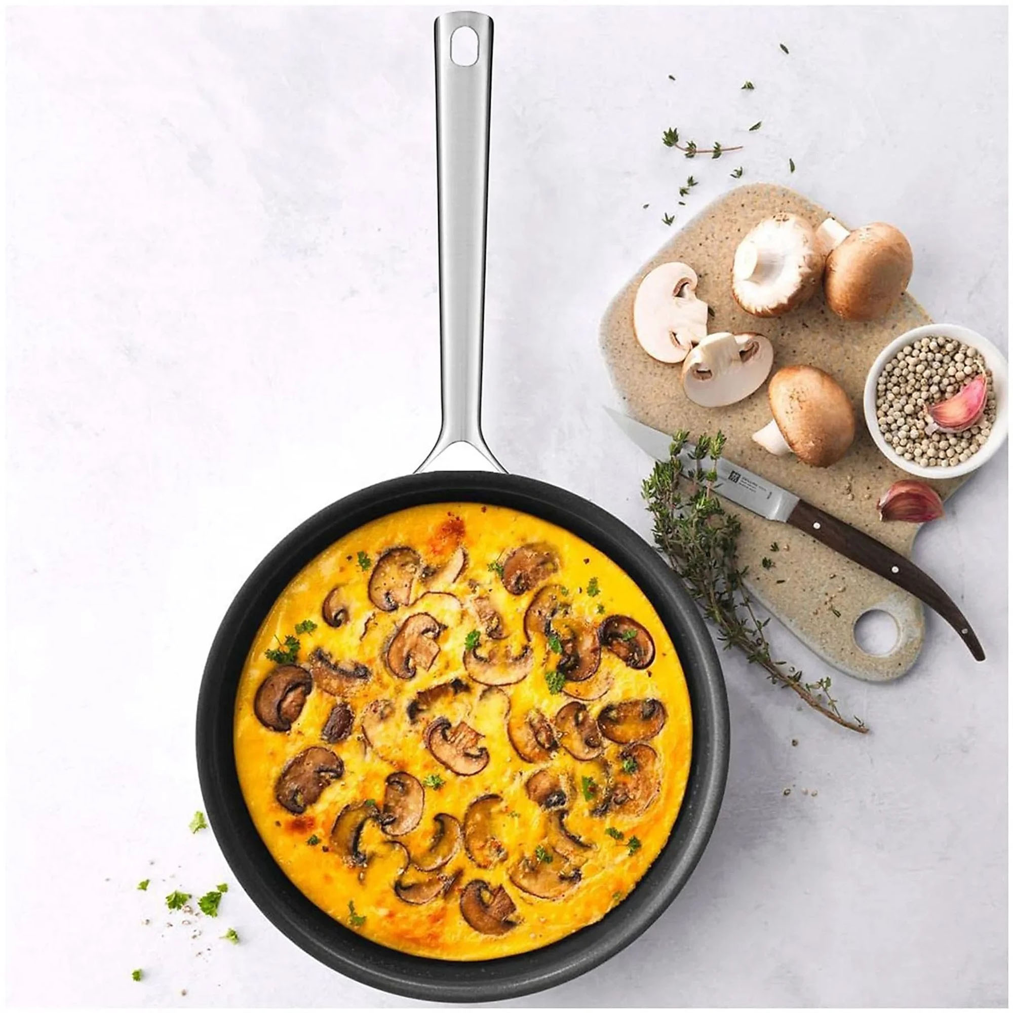 Sett med 2 non-stick stekepanner "TrueFlow" produsert av Zwilling, laget av høykvalitets 18/10 rustfritt stål med satengfinish.