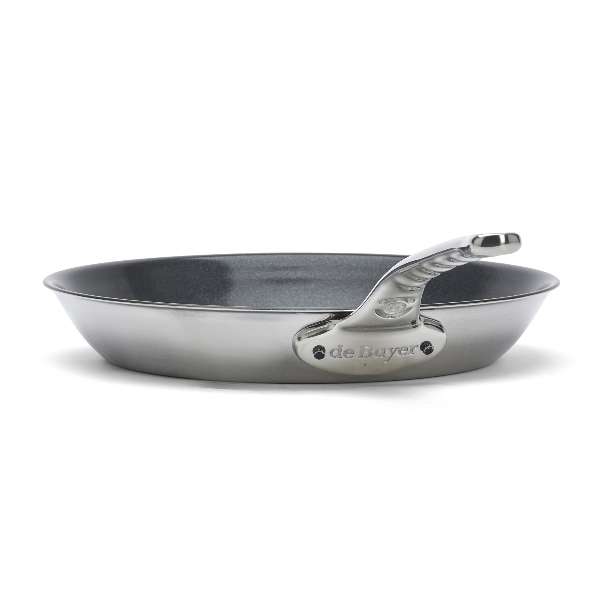 Stekepanne med slippbelegg og keramisk belegg, diameter 28 cm, høyde 4 cm, laget av 2,7 mm tykt rustfritt stål, merket de Buyer . Stekepannen er ideell for tilberedning av delikat mat som fisk.
