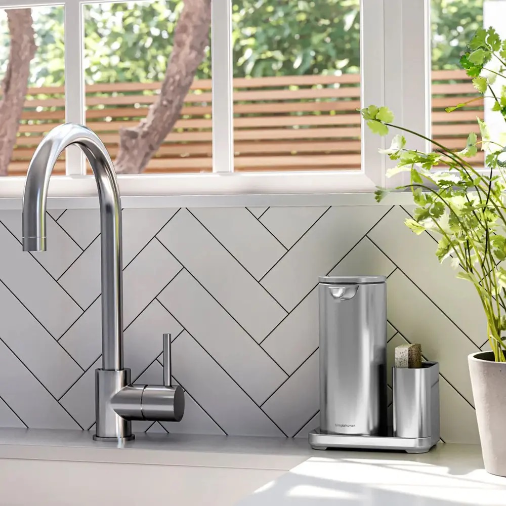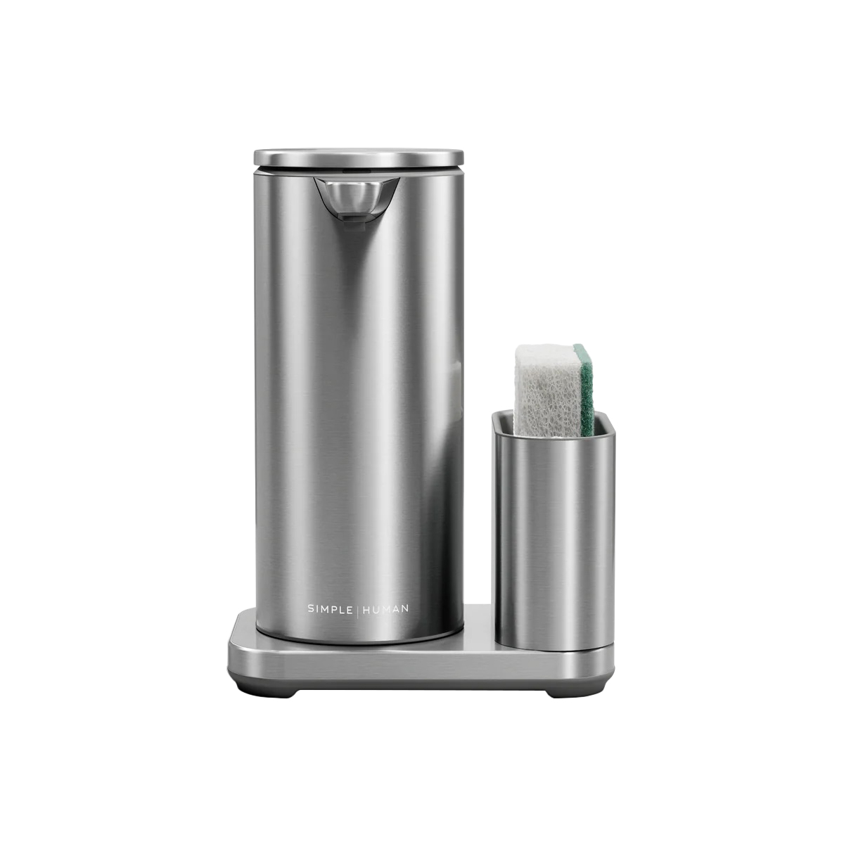 Zoptymalizowany pod kątem efektywnego mycia naczyń, dozownik posiada uchwyt ze stali nierdzewnej do przechowywania gąbki do mycia naczyń, dzięki czemu jest zawsze pod ręką. Mieści o 50% więcej płynu niż standardowa pompka simplehuman , dzięki czemu rzadziej trzeba go uzupełniać.