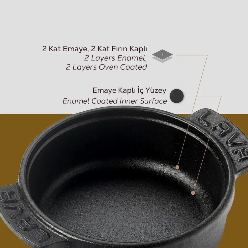 Emalia szklista, stosowana do wykończenia zewnętrznego naczyń żeliwnych Lava , jest uzyskiwana poprzez natryskiwanie proszku szklanego w temperaturze 750–850°C. Przylega ona do powierzchni garnka, tworząc warstwę ochronną, która dodatkowo wspomaga optymalną dystrybucję ciepła.