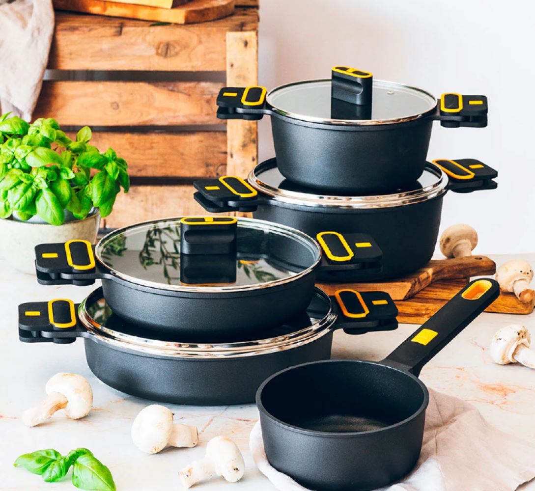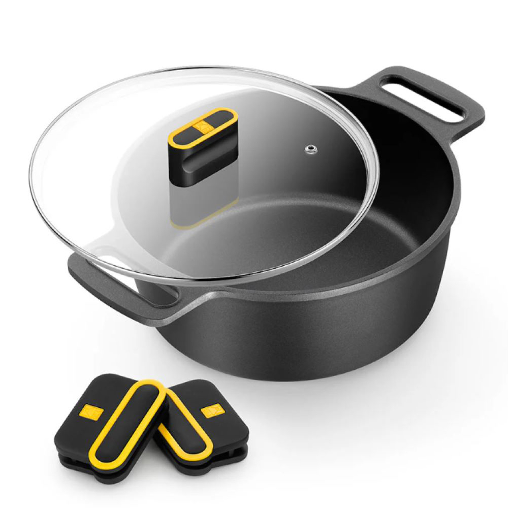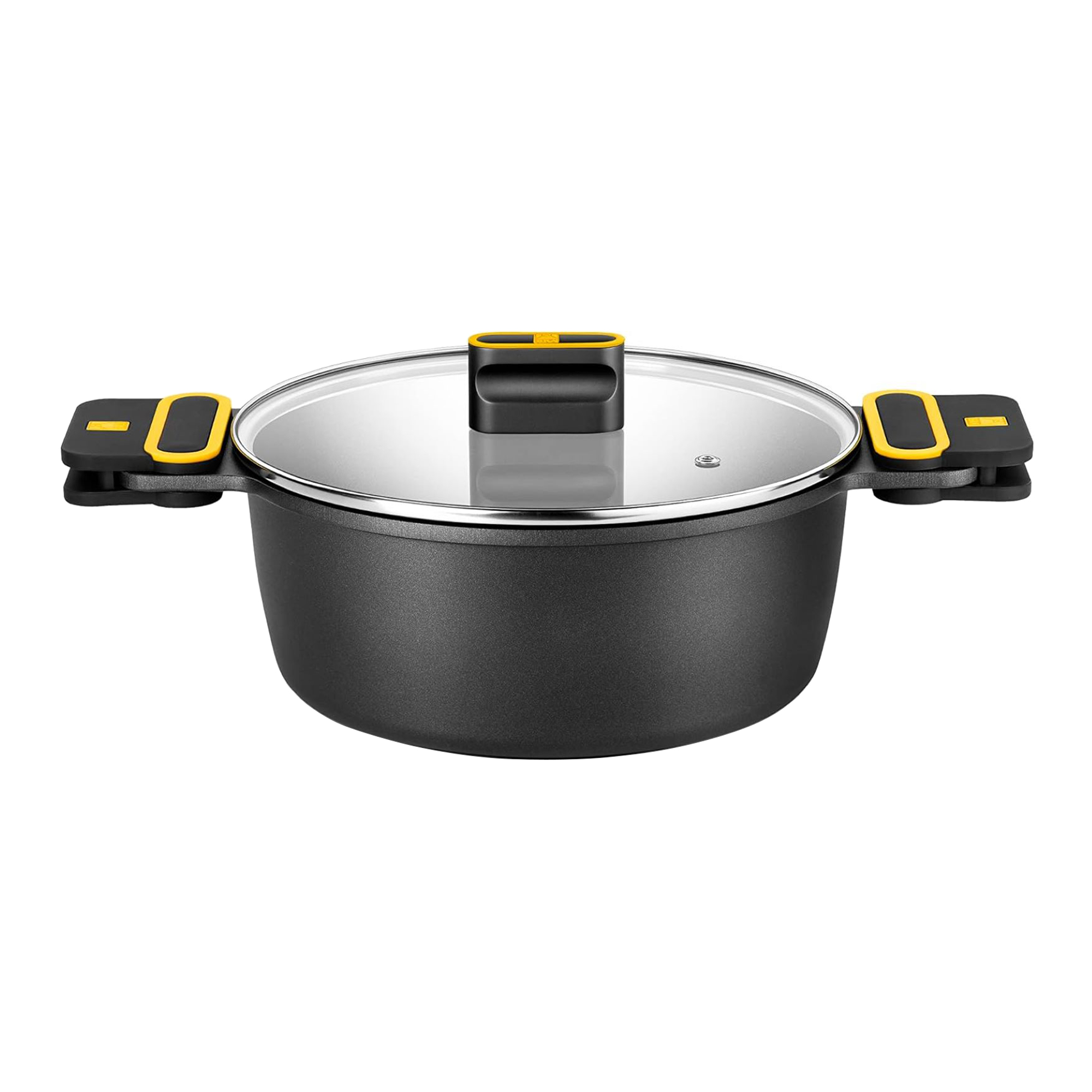 Posiada ultraodporną powierzchnię, a uchwyty zapewniają pewny i wygodny chwyt. Zarówno silikonowe uchwyty, jak i bakelitowy przycisk szklanej pokrywki są czarne z żółtymi detalami, charakterystycznymi dla kolekcji Daily Pro .