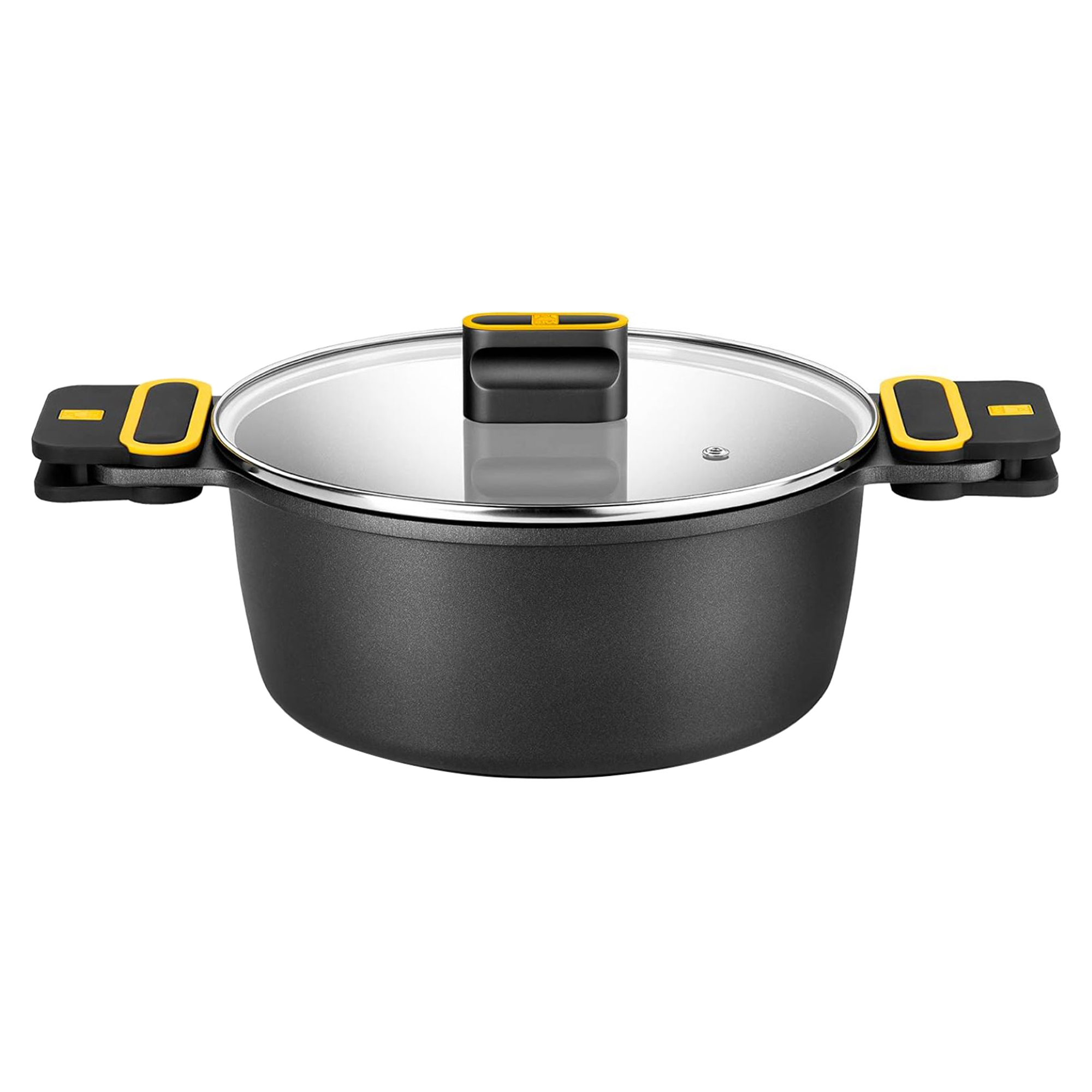Posiada ultraodporną powierzchnię, a uchwyty zapewniają pewny i wygodny chwyt. Zarówno silikonowe uchwyty, jak i bakelitowy przycisk szklanej pokrywki są czarne z żółtymi detalami, charakterystycznymi dla kolekcji Daily Pro .