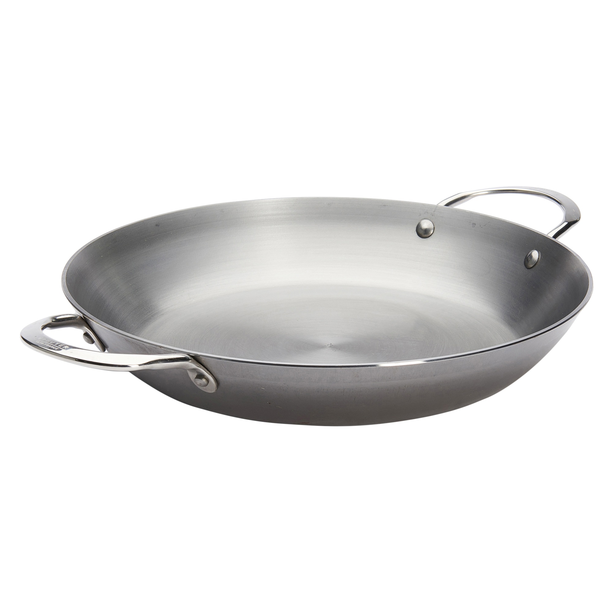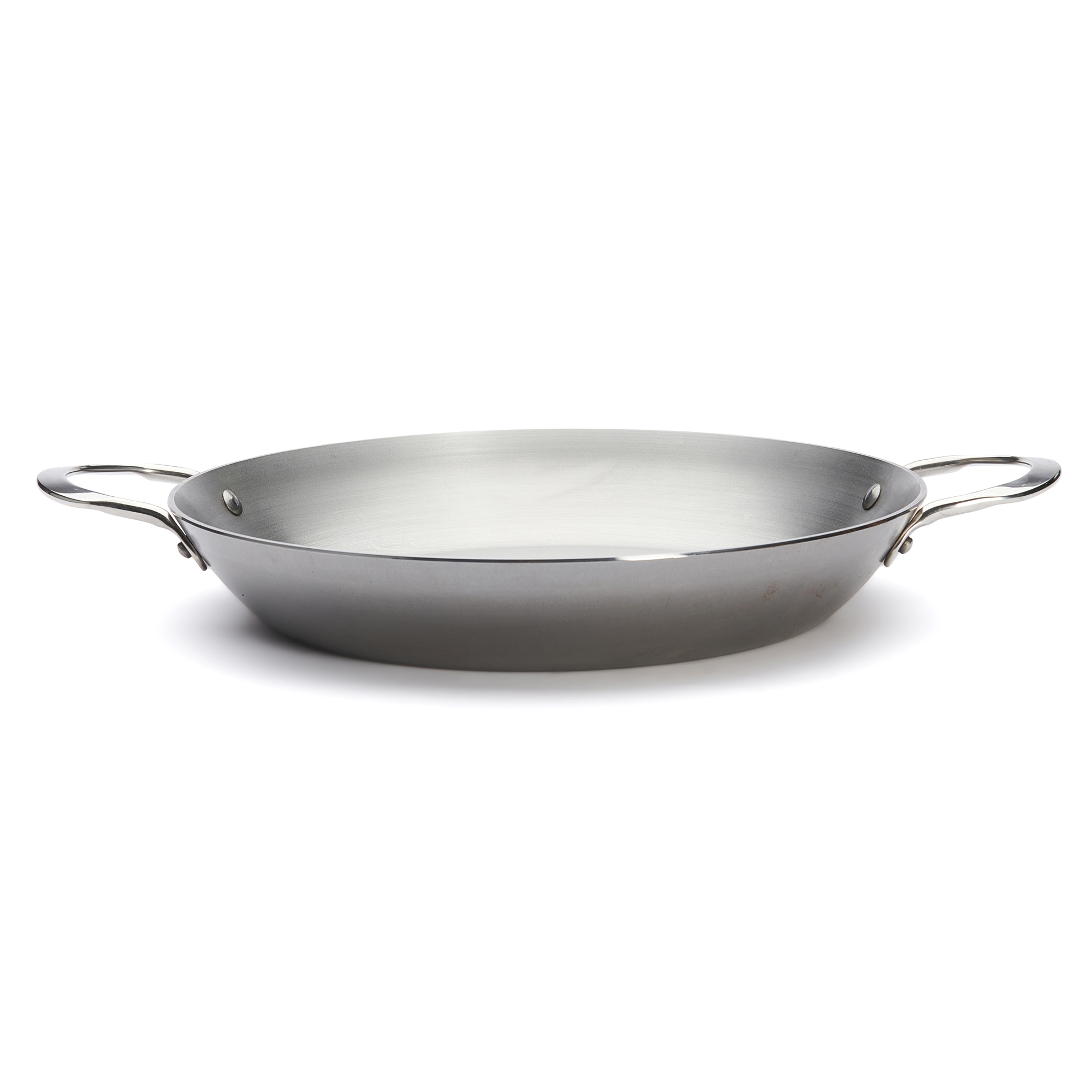 Patelnia do paelli ma autentyczny design „Lyonnaise” z zaokrąglonymi krawędziami ułatwiającymi przenoszenie jedzenia na talerze, a wygięte uchwyty w stylu francuskim są wykonane ze stali nierdzewnej i przymocowane solidnymi nitami.