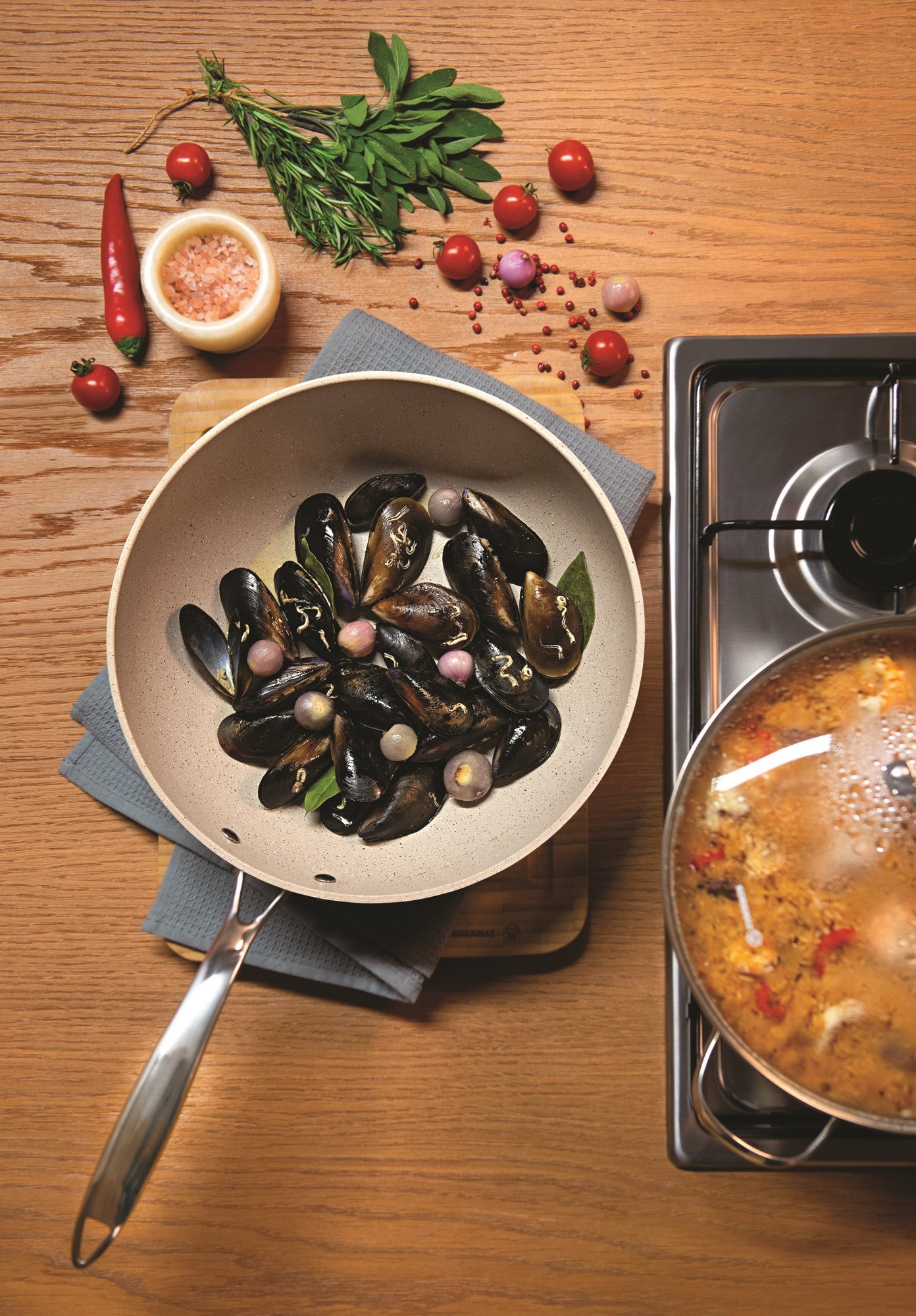 Naczynia z gamy Granita są wykonane z materiałów pochodzących z recyklingu i recyklingu, przy użyciu ekologicznej technologii, z nieprzywierającą i odporną na zarysowania powłoką PTFE od wewnątrz oraz zewnętrzną warstwą silikonu, która jest odporna na wysokie temperatury.