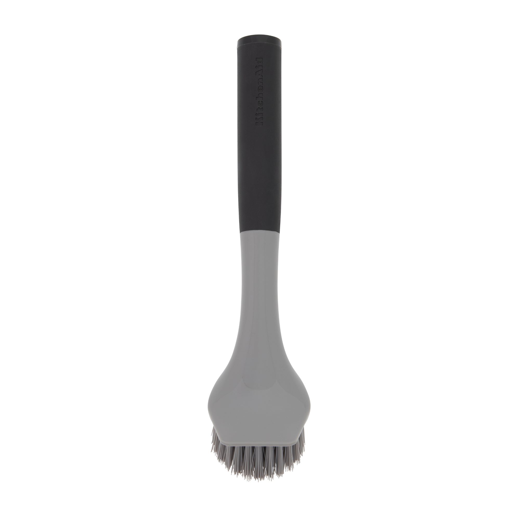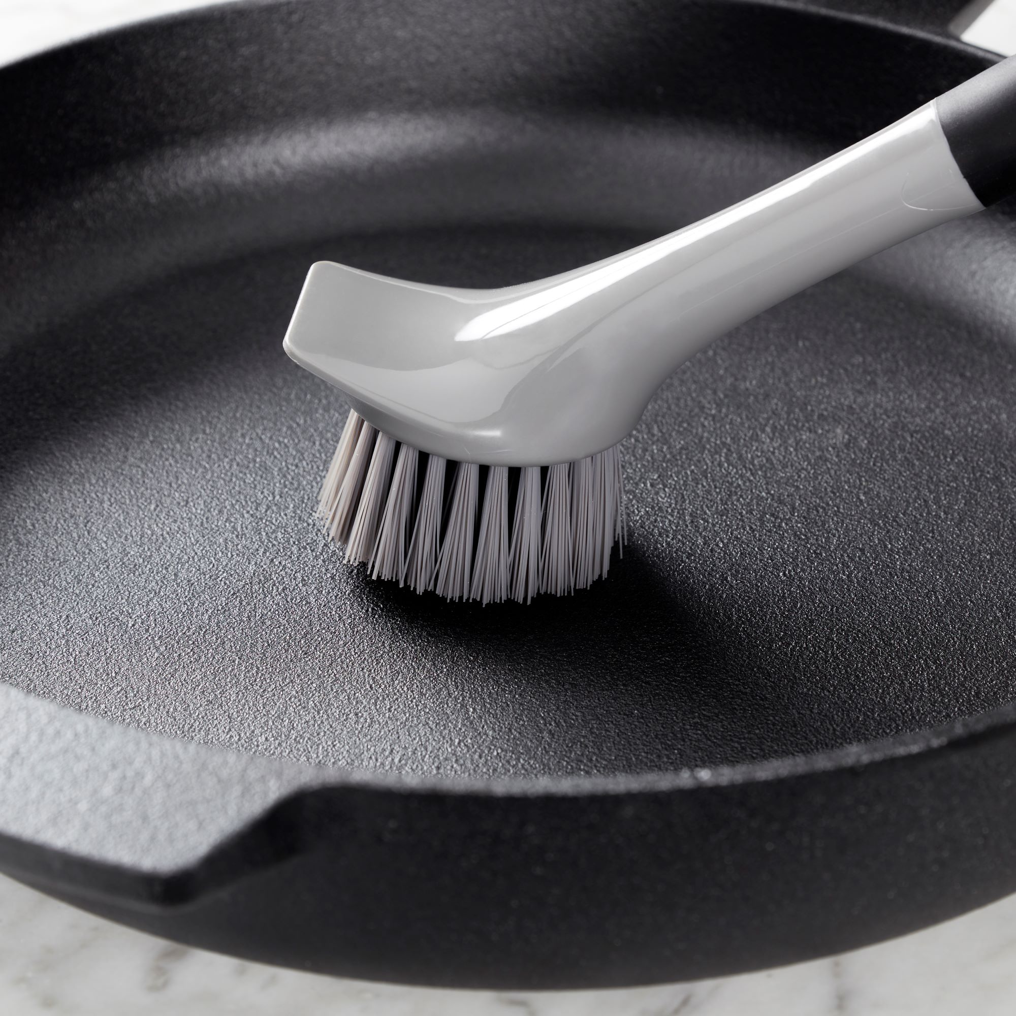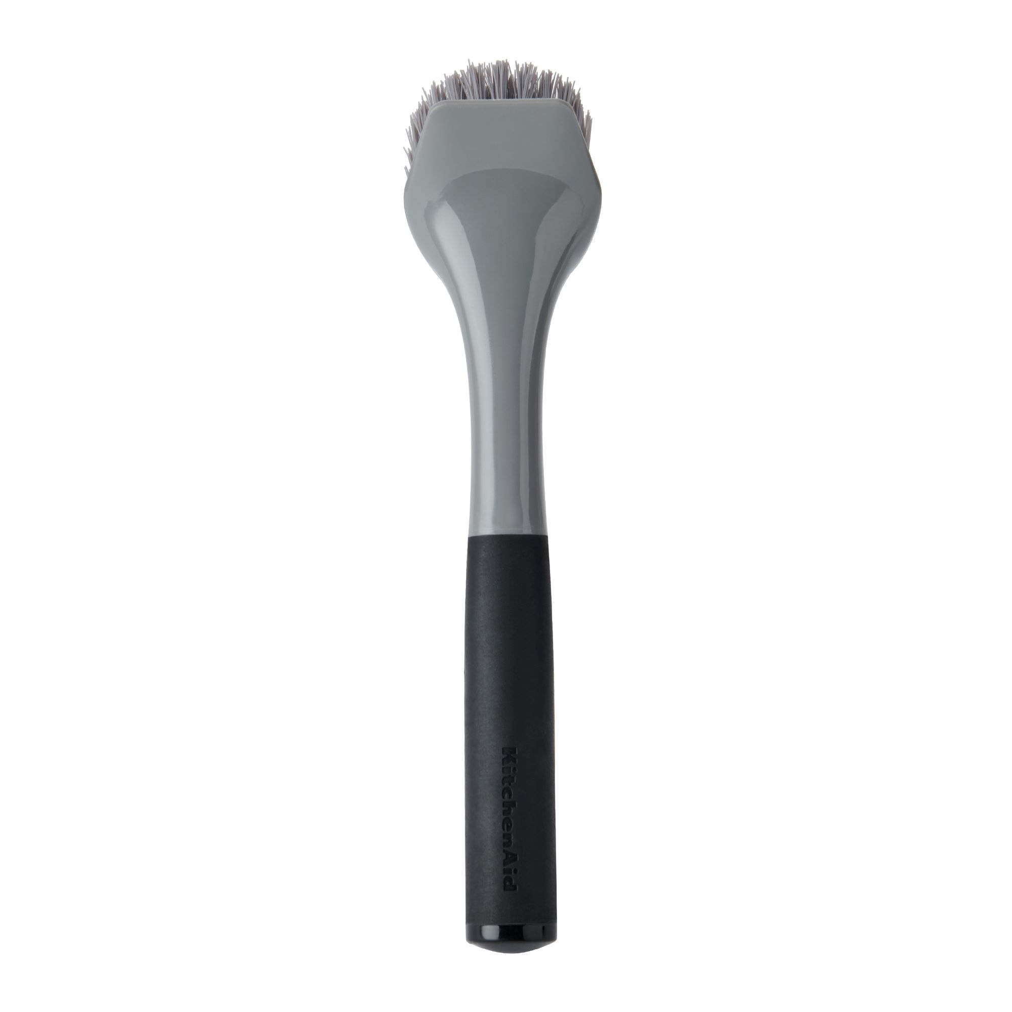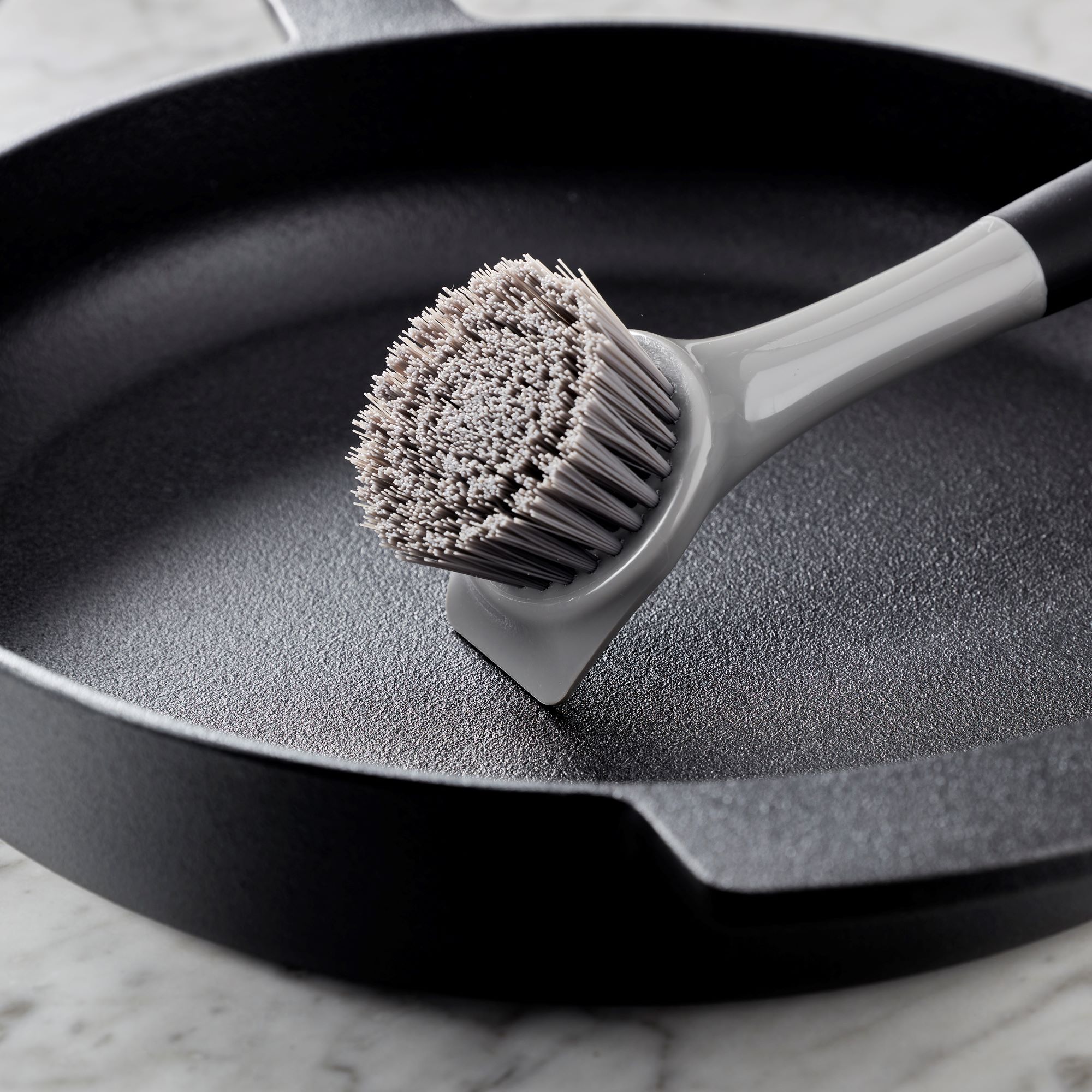 Usuń uporczywe resztki jedzenia z powierzchni naczyń żeliwnych za pomocą szczotki do mycia naczyń KitchenAid wykonanej z tworzywa sztucznego.