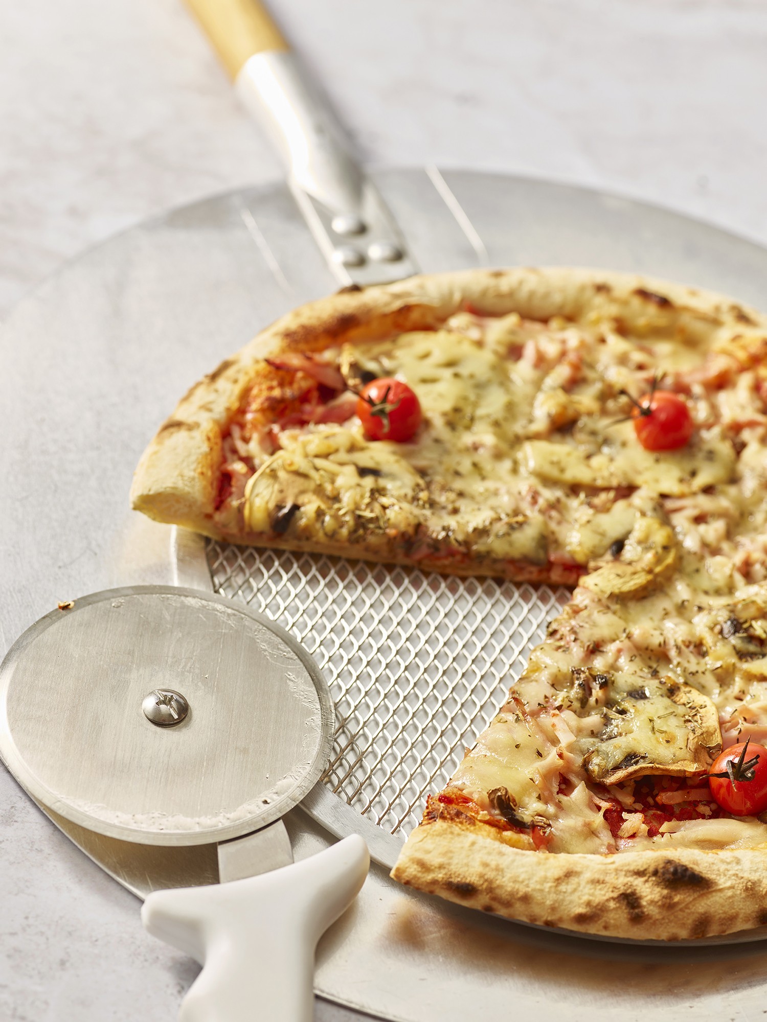 A superfície da panela é projetada para facilitar o manuseio da pizza com a ajuda de uma casca de pizza.