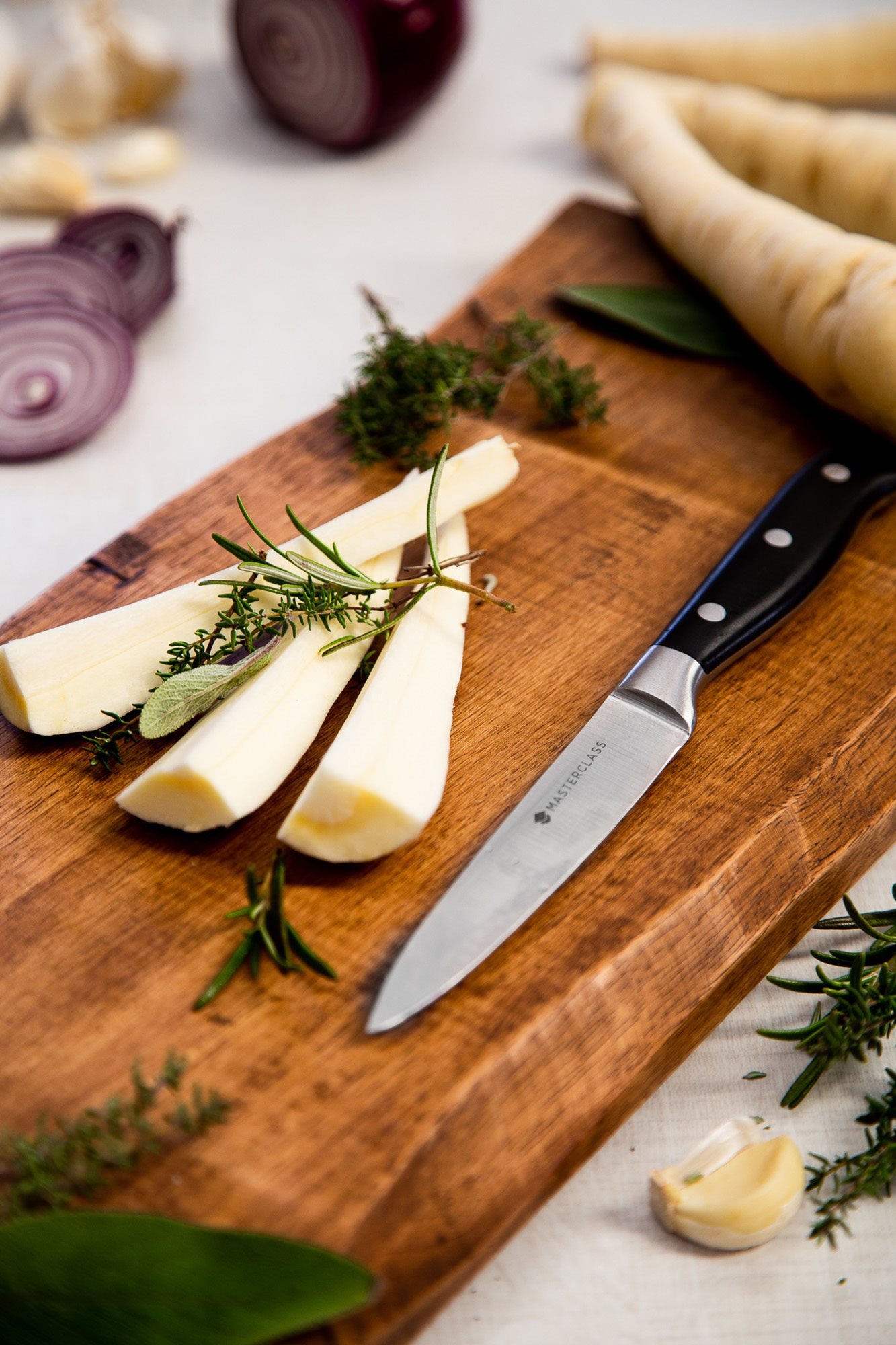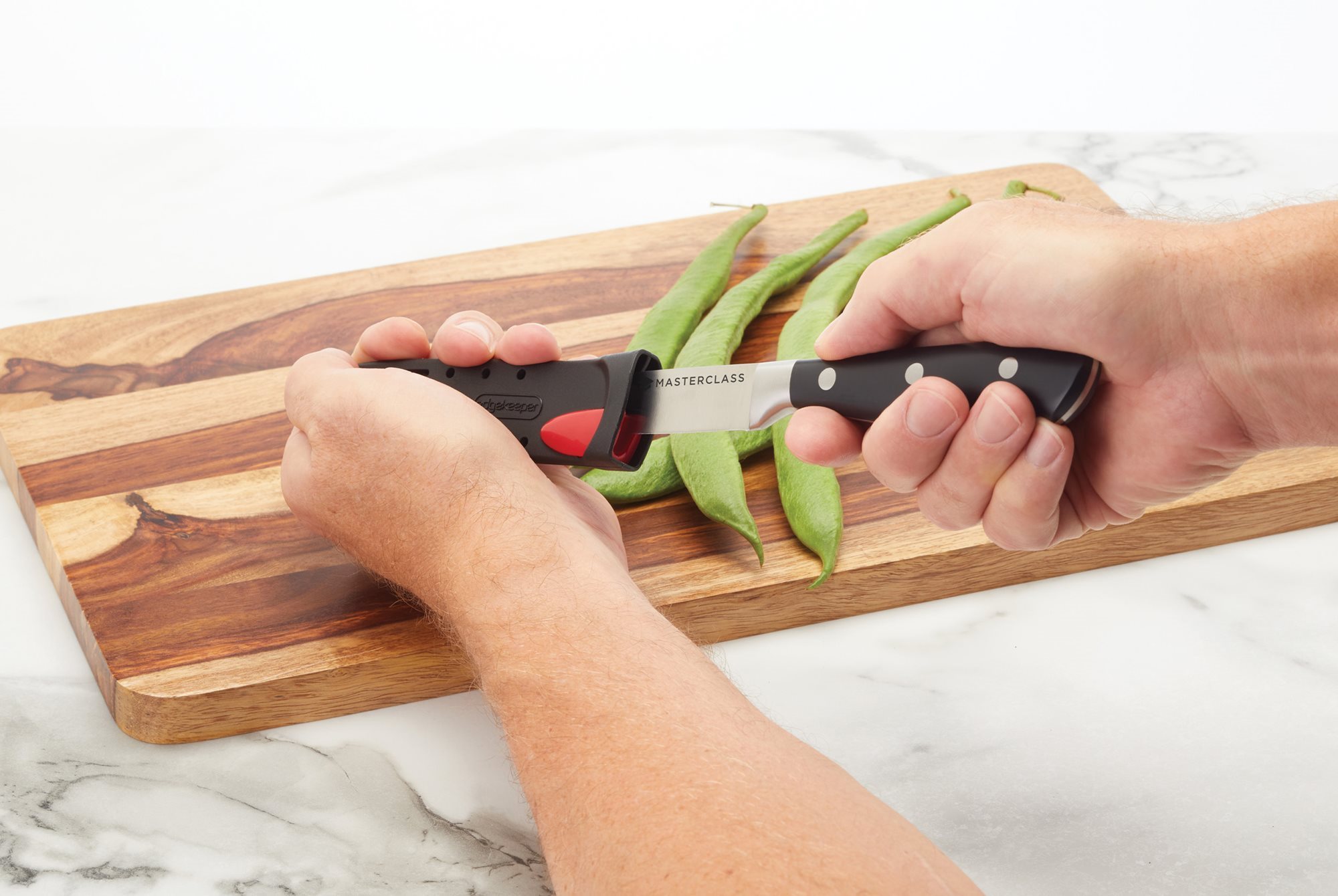Esta faca combina o design elegante característico da marca MasterClass com a tecnologia patenteada Edgekeeper – possui uma bainha protetora com afiador integrado.