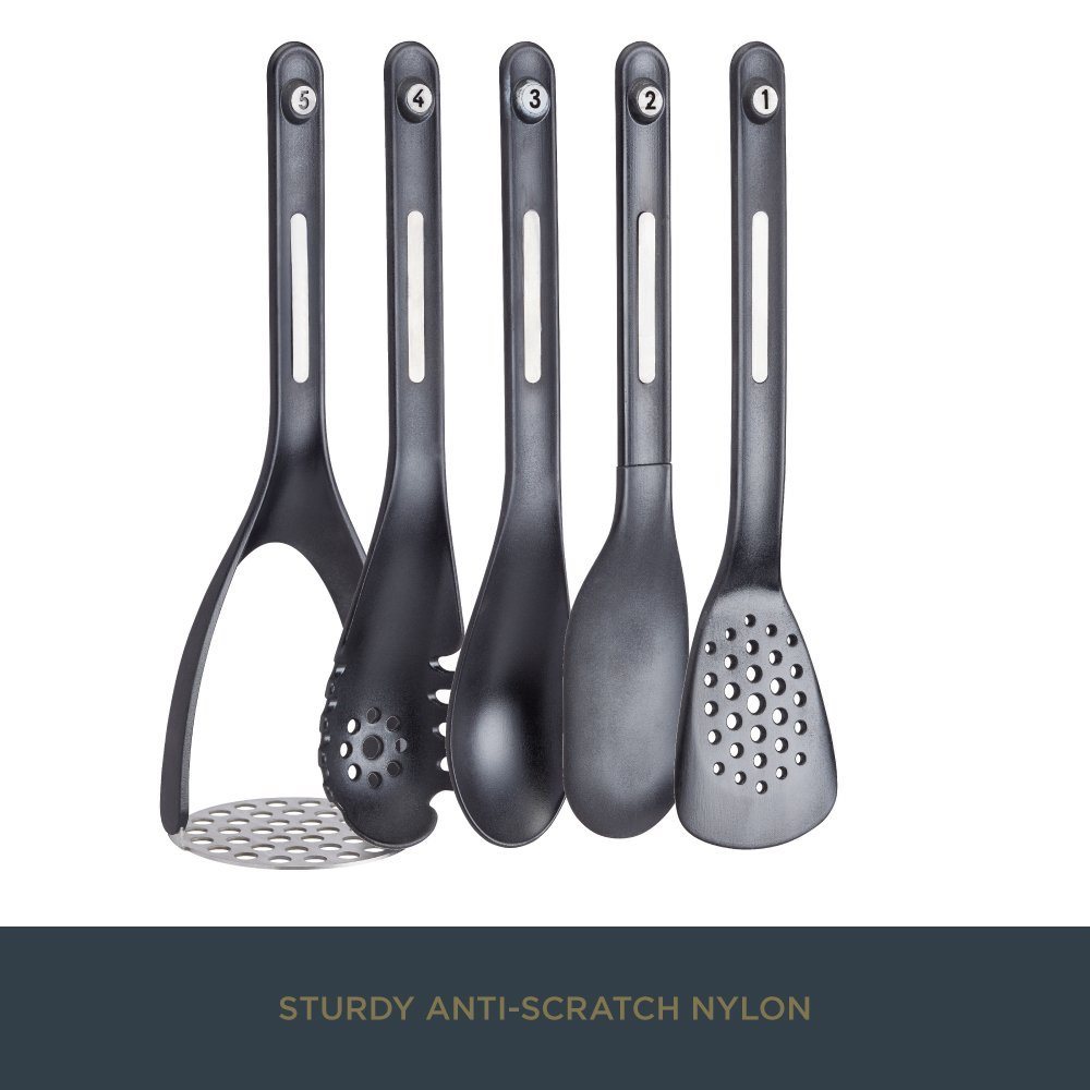 Um conjunto completo de 5 utensílios de cozinha que ocupam tão pouco espaço quanto um único utensílio! Parece impossível, mas com o conjunto de 5 utensílios de cozinha da MasterClass você não só terá à mão todos os utensílios básicos que não podem faltar no seu armário, como também economizará espaço de armazenamento.