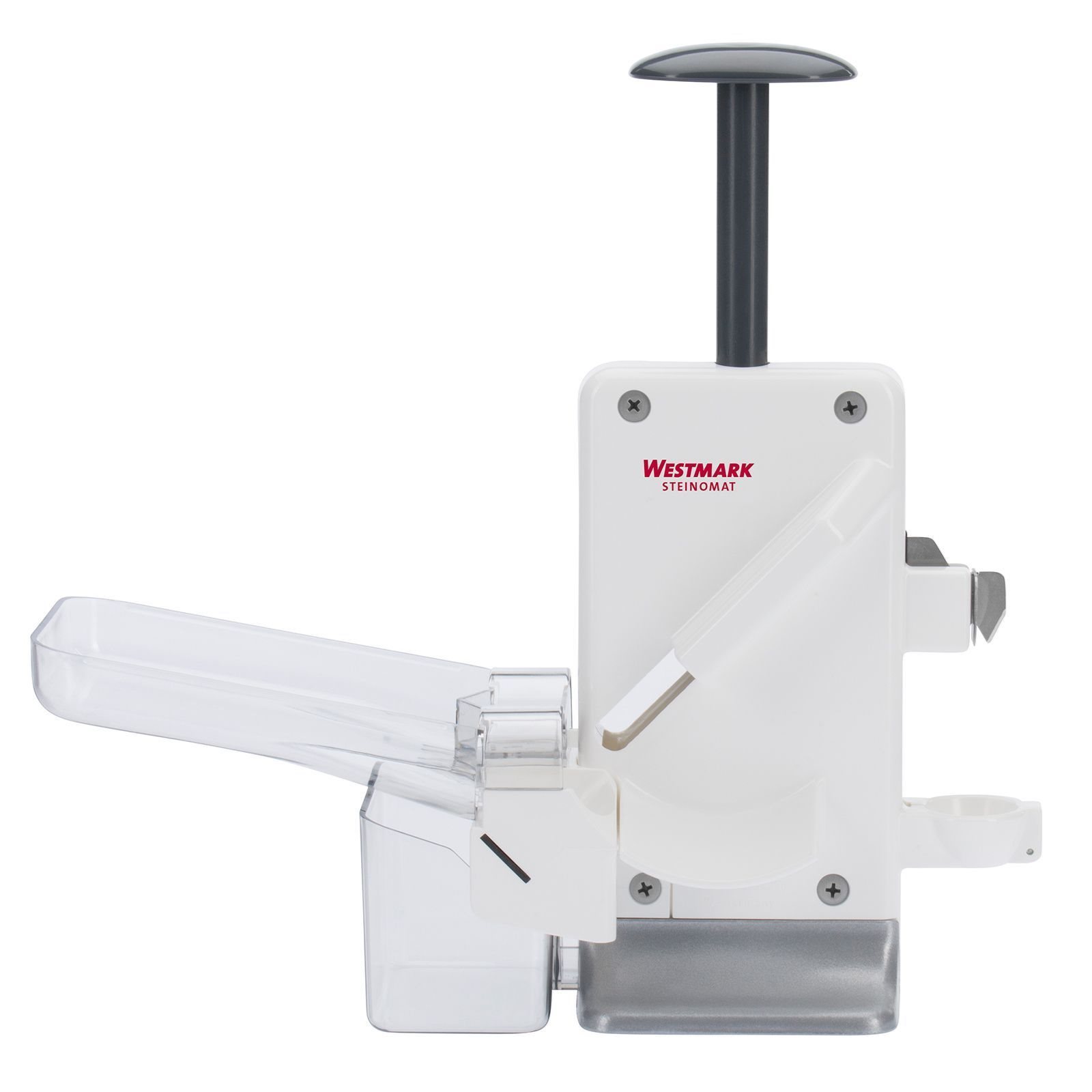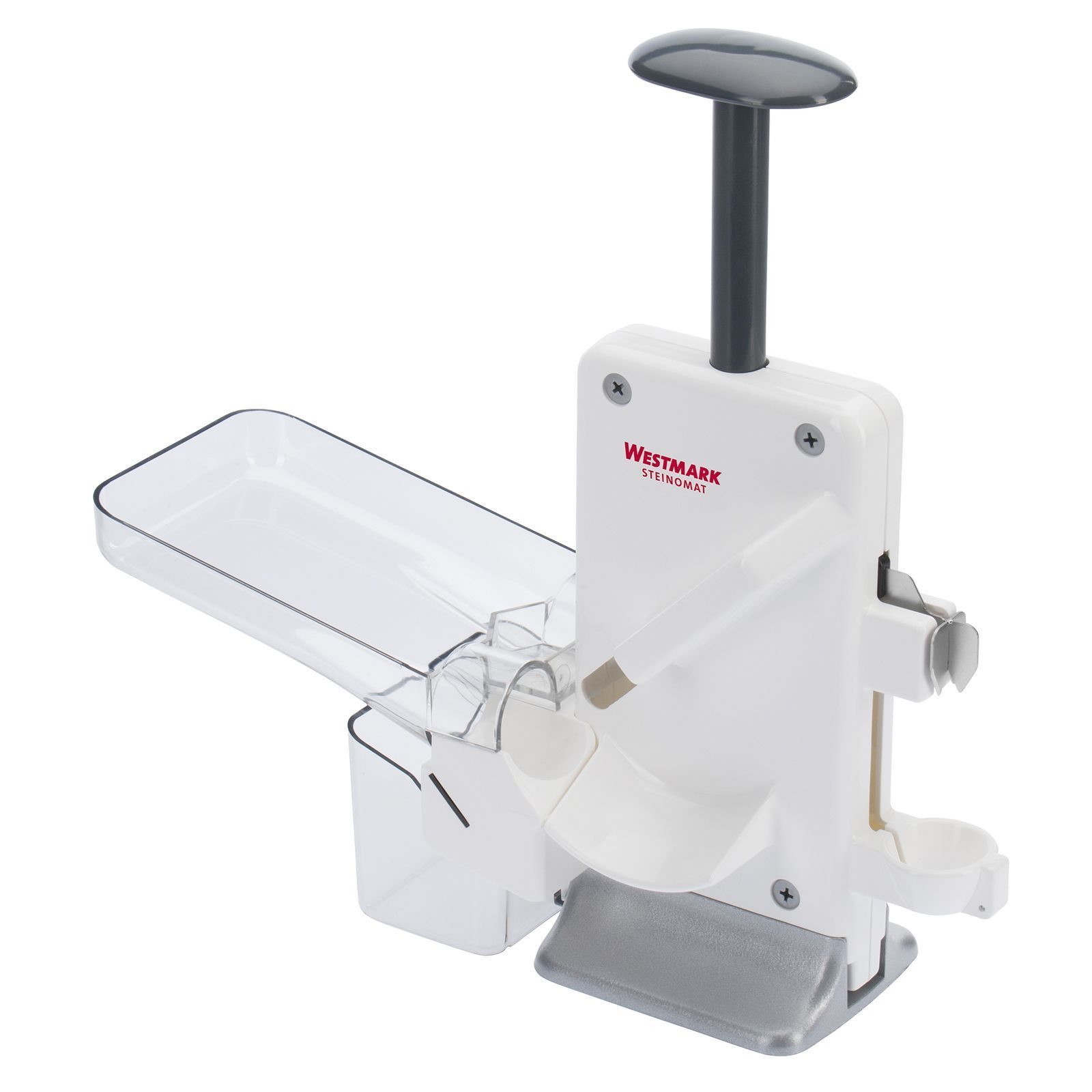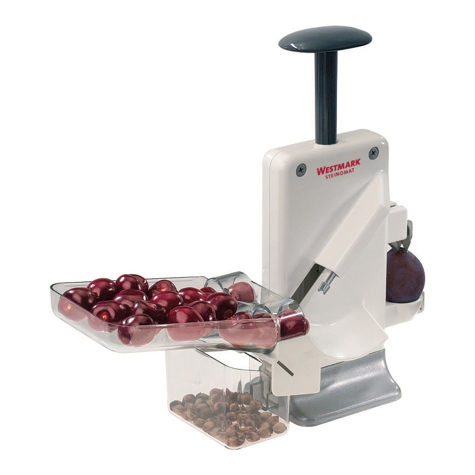 Dispositivo para retirar caroços de cerejas e ameixas, marca Westmark , em plástico e aço inoxidável.