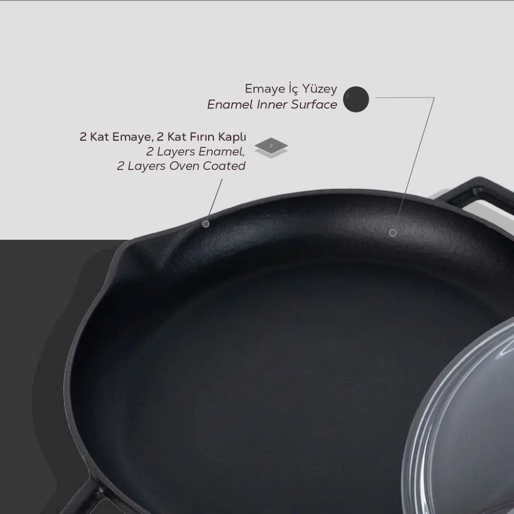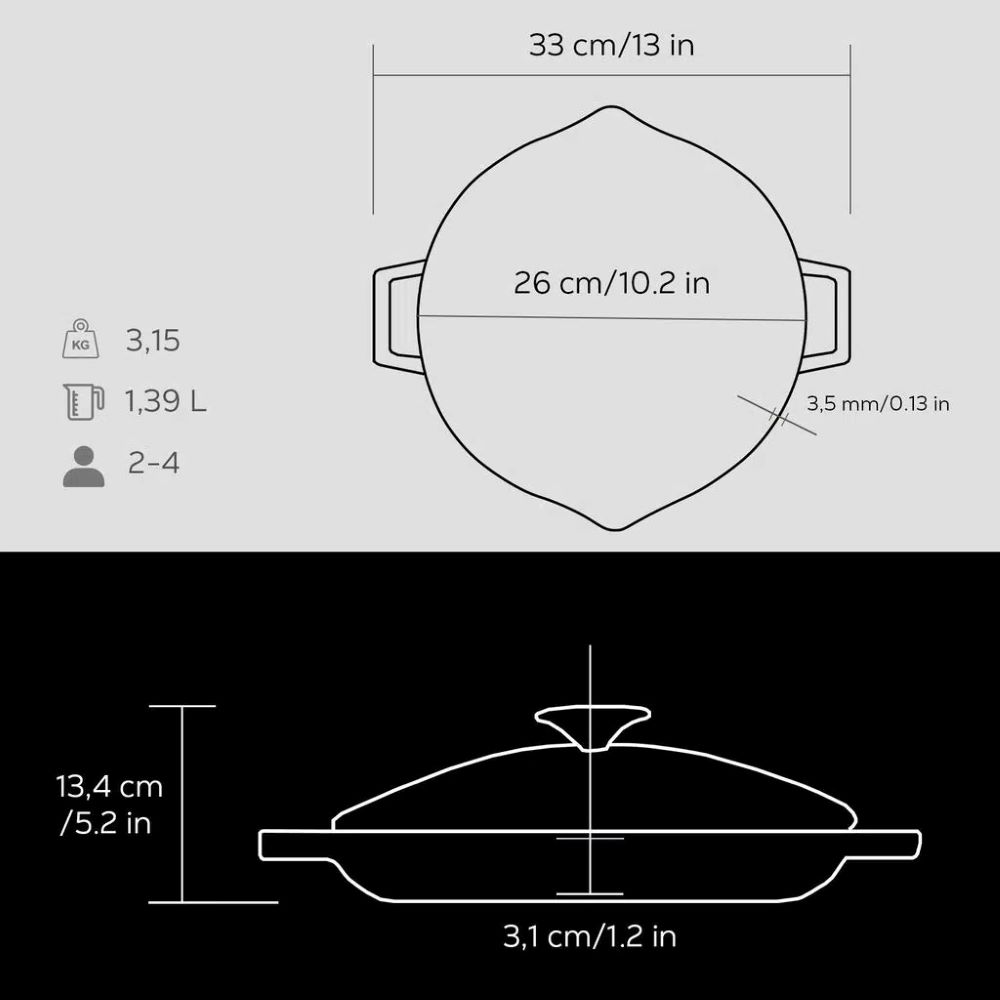 As paredes da panela têm 3,5 mm de espessura, e o interior possui uma camada de esmalte preto que ajuda a criar uma superfície antiaderente ao cozinhar com gorduras.