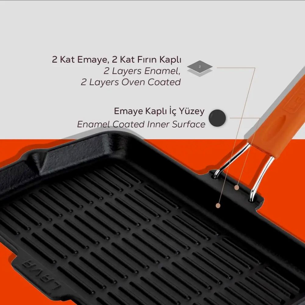 Grelha, fabricada pela Lava, dimensões 21 x 36 cm, feita de ferro fundido.