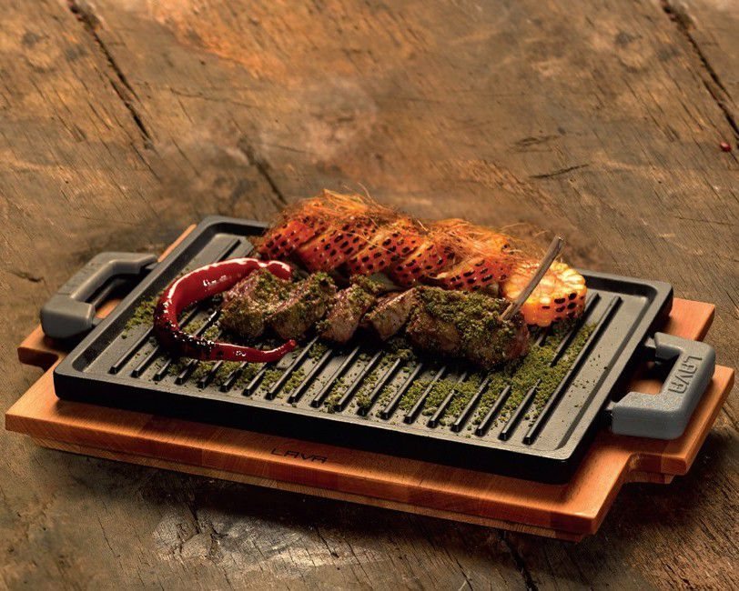 Grill em ferro fundido com suporte em madeira produzida pela Lava.