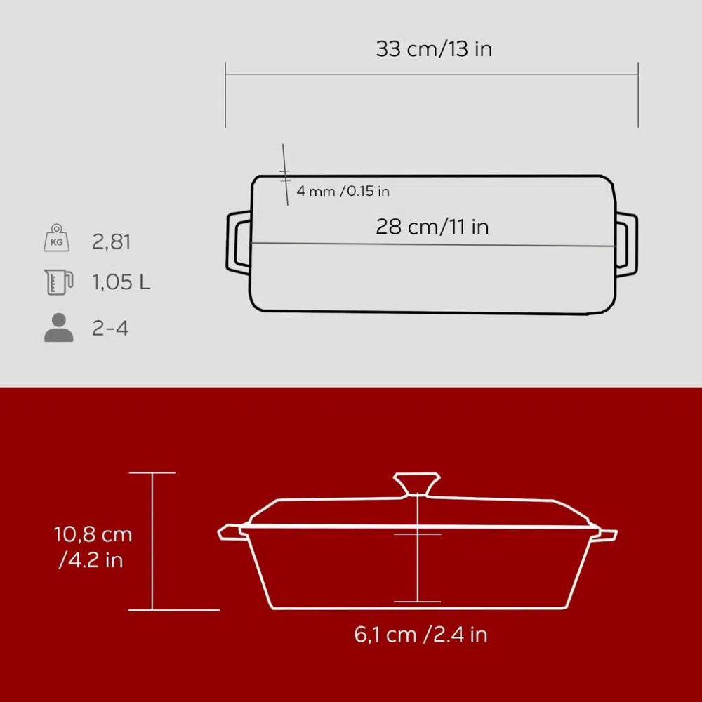 Prato terrine, marca Lava, dimensões de 8,5 x 26,5 x 6 cm, capacidade de 1 L, feita de ferro fundido. Este produto pode ser usado para cozinhar legumes, peixes e até mesmo para assar pão.