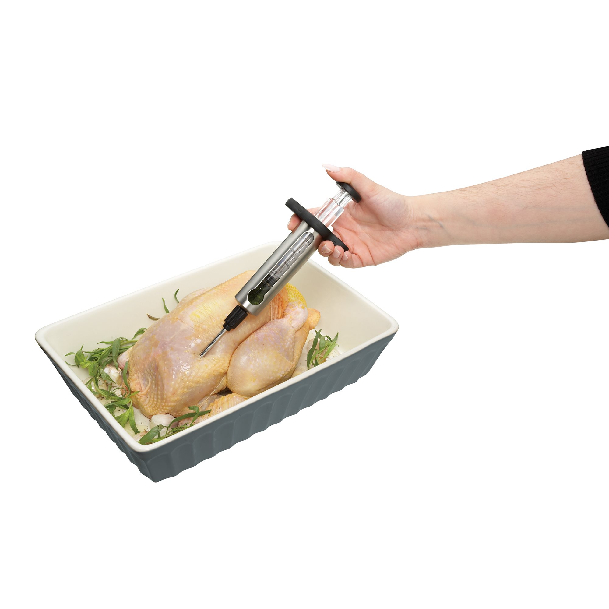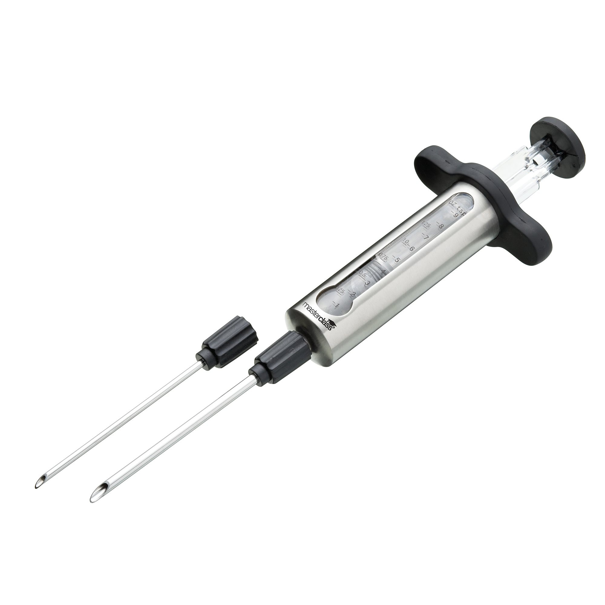 Seringa este echipata cu 2 ace din inox - unul subtire, pentru injectarea marinatelor lichide si unul gros, pentru injectarea marinatelor cu verdeata si condimente direct in carne.