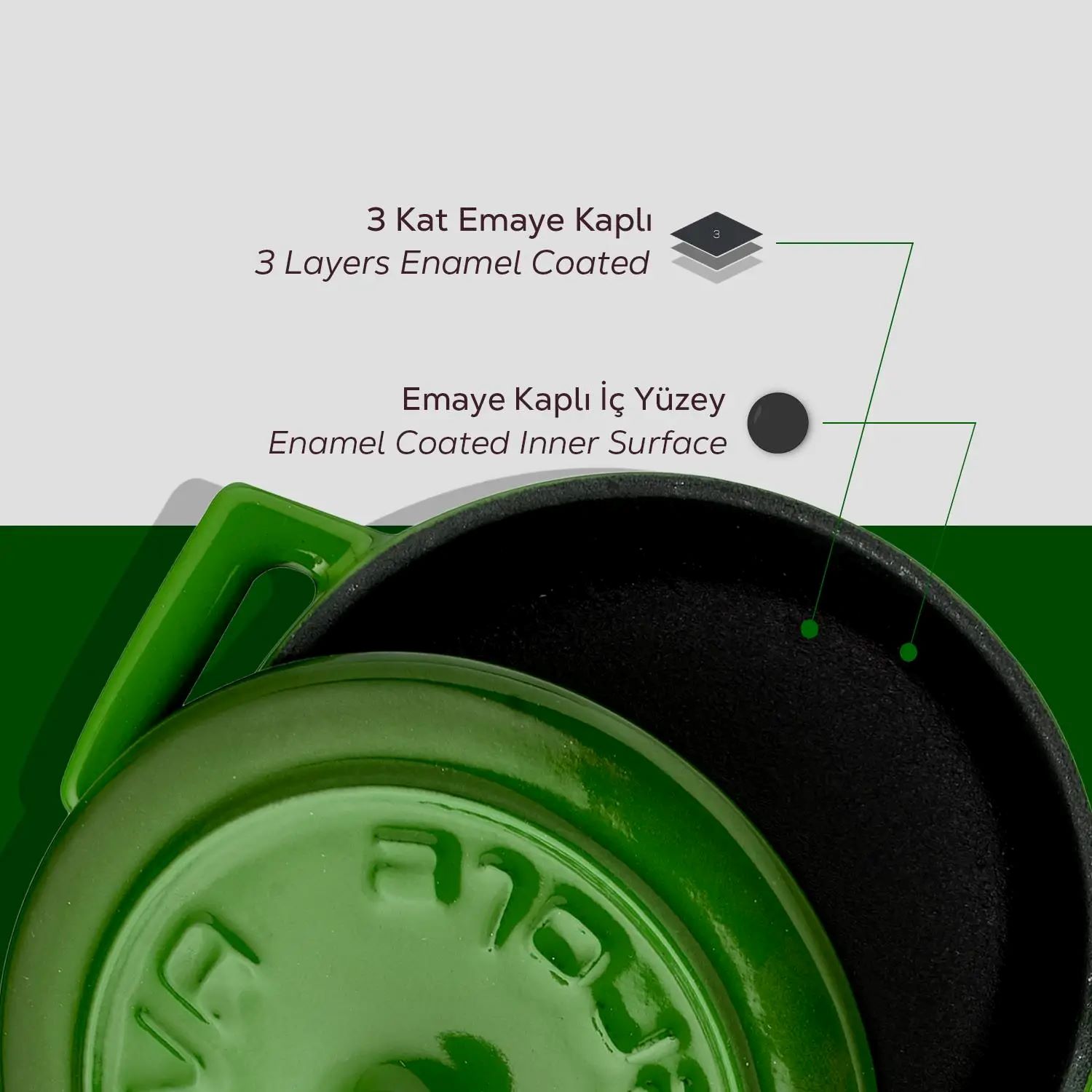 Стекловидная эмаль, материал, используемый для внешней отделки чугунной посуды Lava , получается путем напыления стеклянного порошка при температуре 750 - 850°C. Стеклянный порошок прилипает к поверхности кастрюли, создавая защитный слой, который также помогает оптимально распределять тепло.