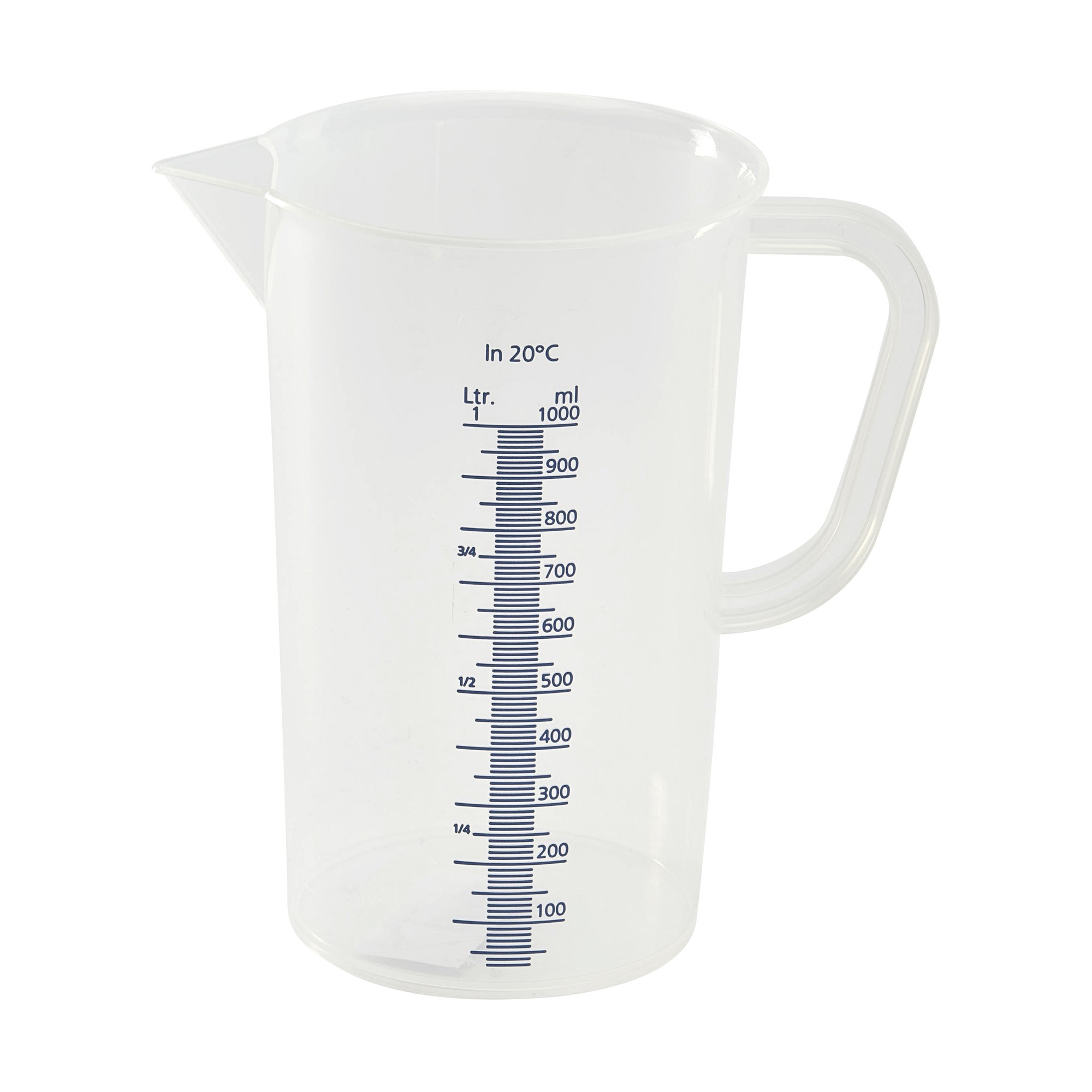 Измерительная кружка,de Buyer марки, диаметр 11,5 см, высота 18 см, которая может измерять объем до 1 л,из прозрачного полипропилена и снабжена синей маркировкой.