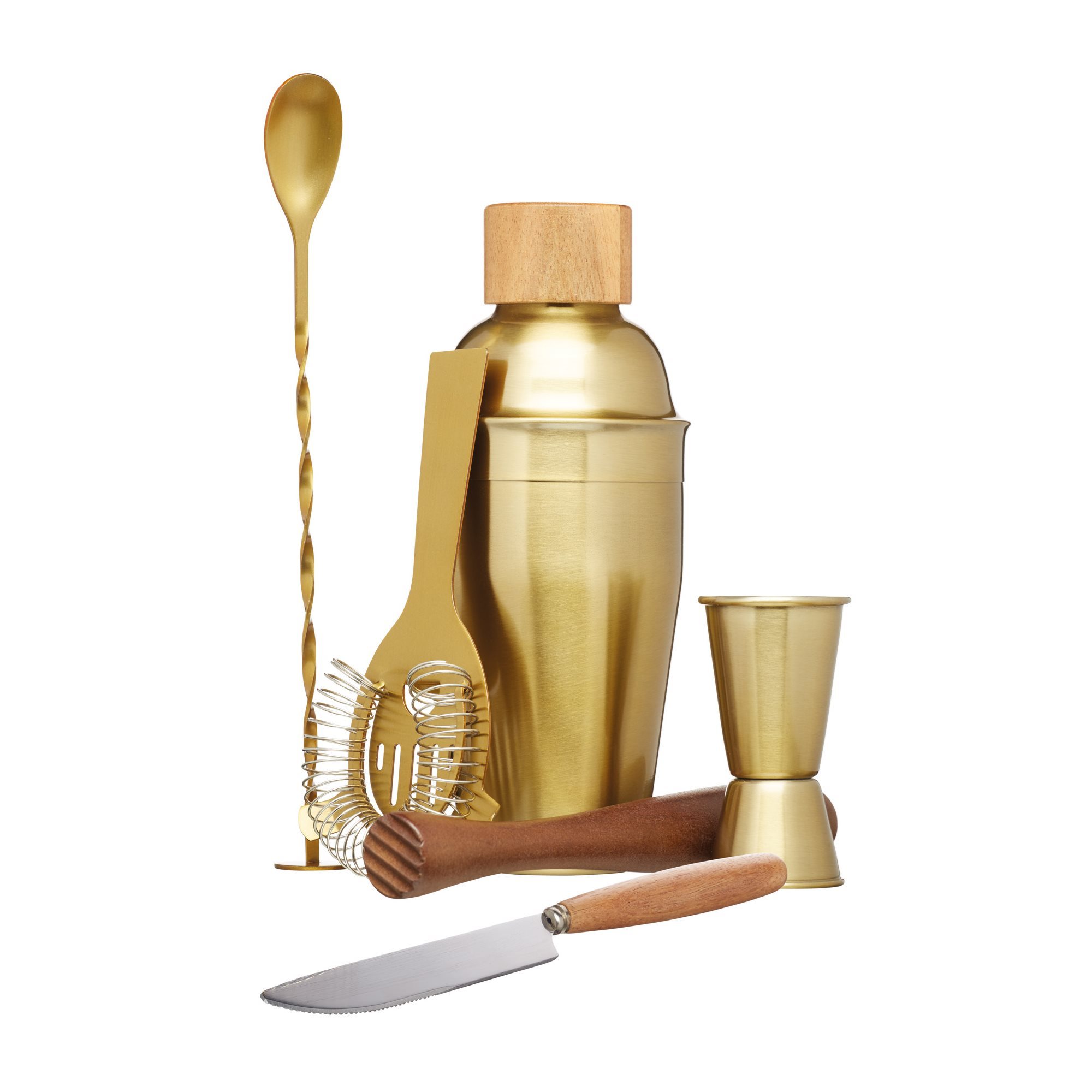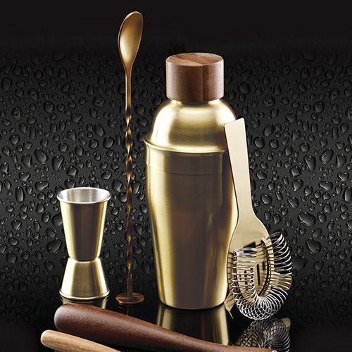 • 1 шейкер из полированной золотой нержавеющей стали с деревянной крышкой;