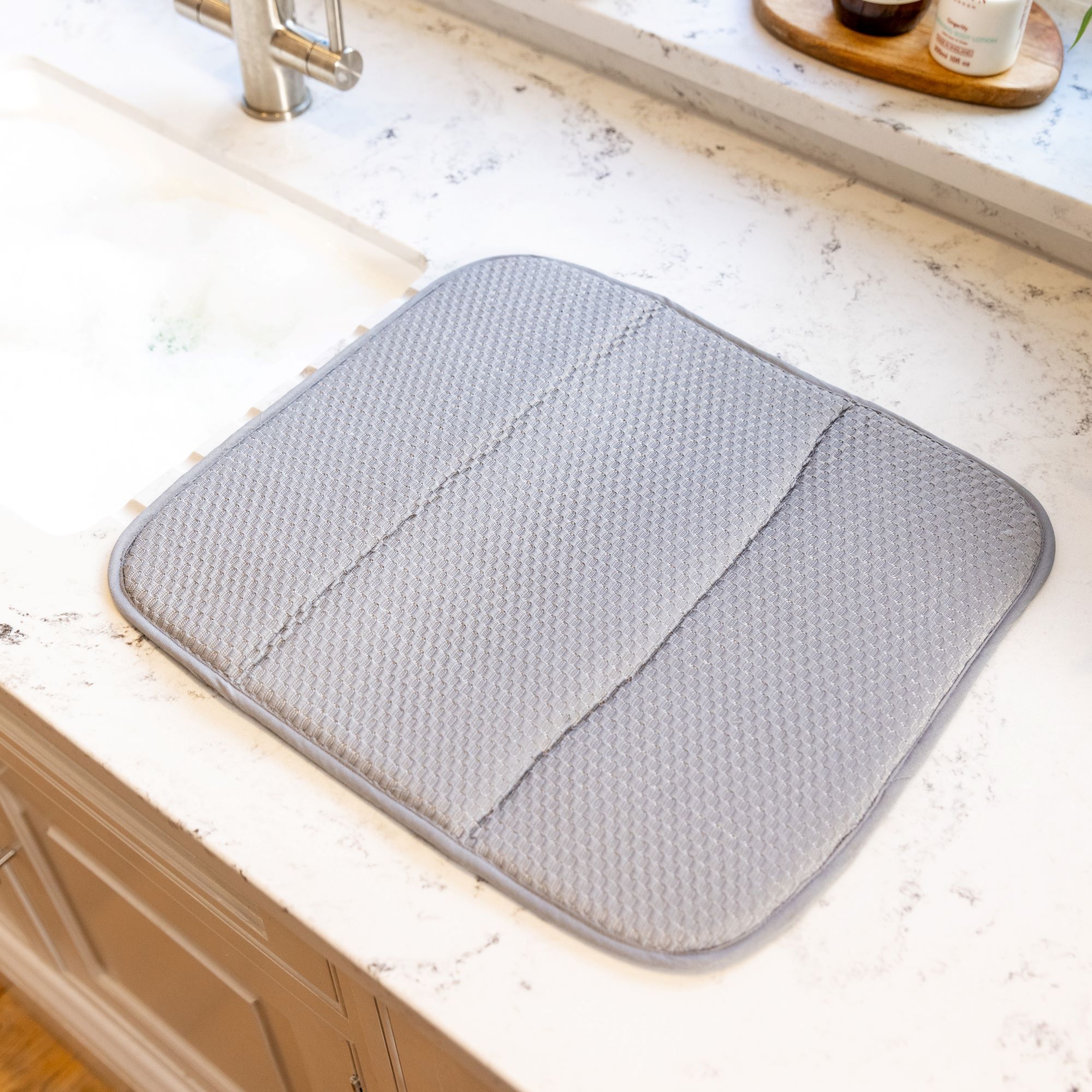 Имея впитывающую поверхность из микрофибры, воздух циркулирует между поверхностью посуды и поверхностью впитывающего мата, что обеспечивает более быстрое высыхание. Для эффективного хранения впитывающий коврик можно сложить.