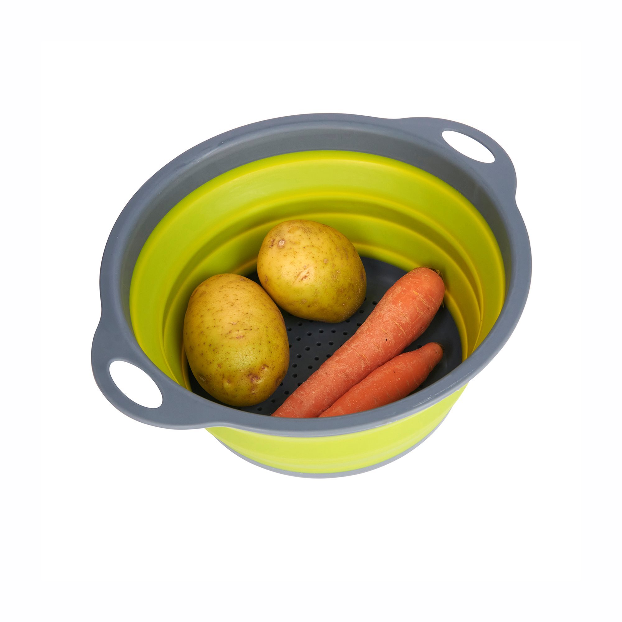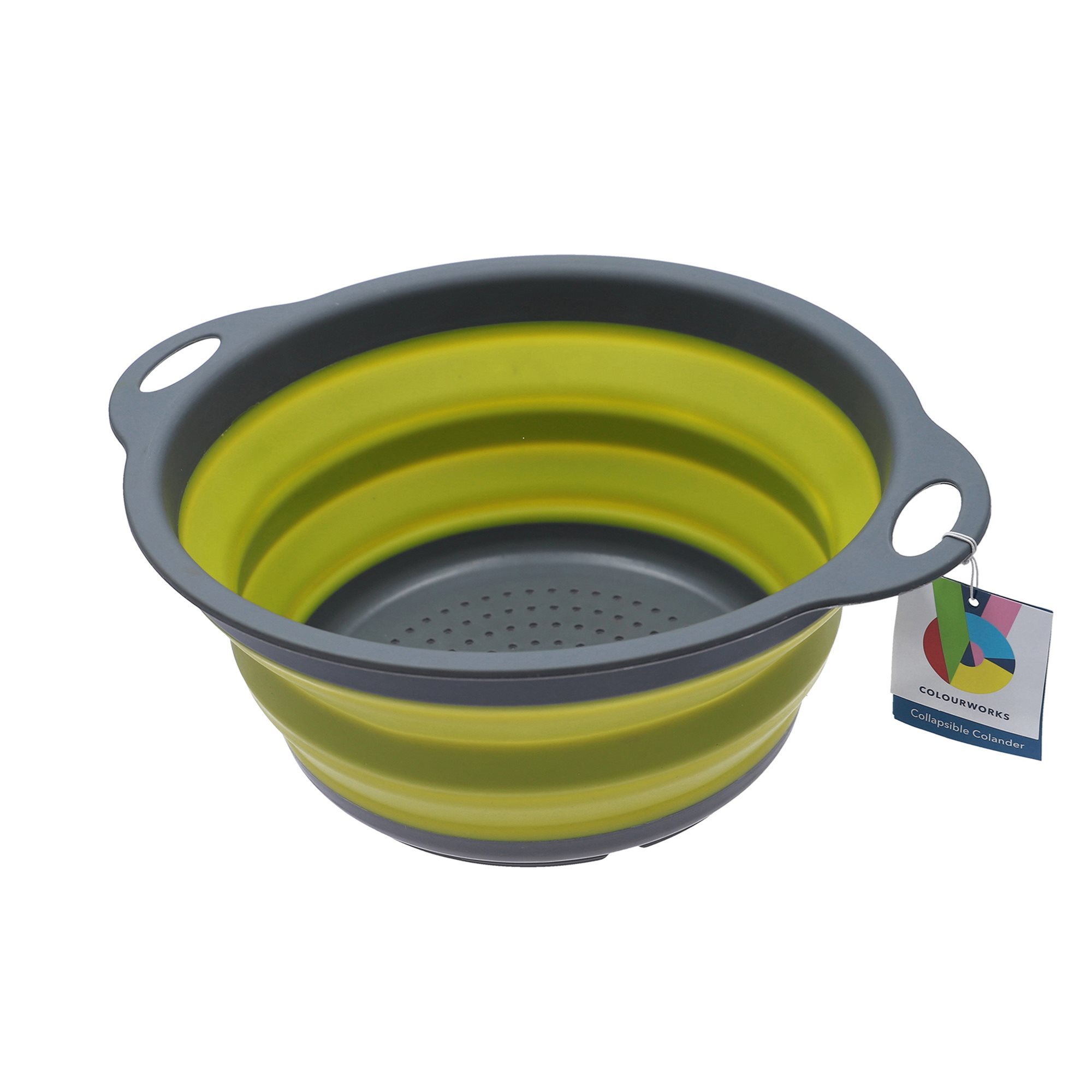 Дуршлаг складной, диаметр 24 см, из зеленого термостойкого силикона, с серыми ручками и ситом, бренд Colourworks.