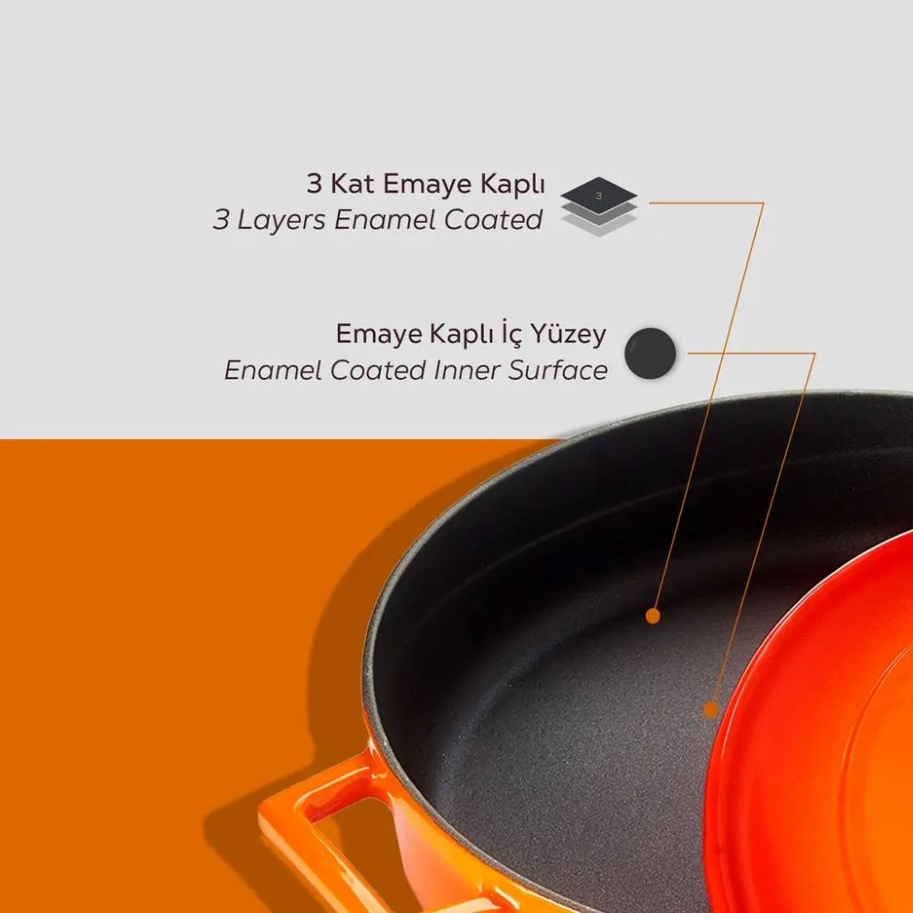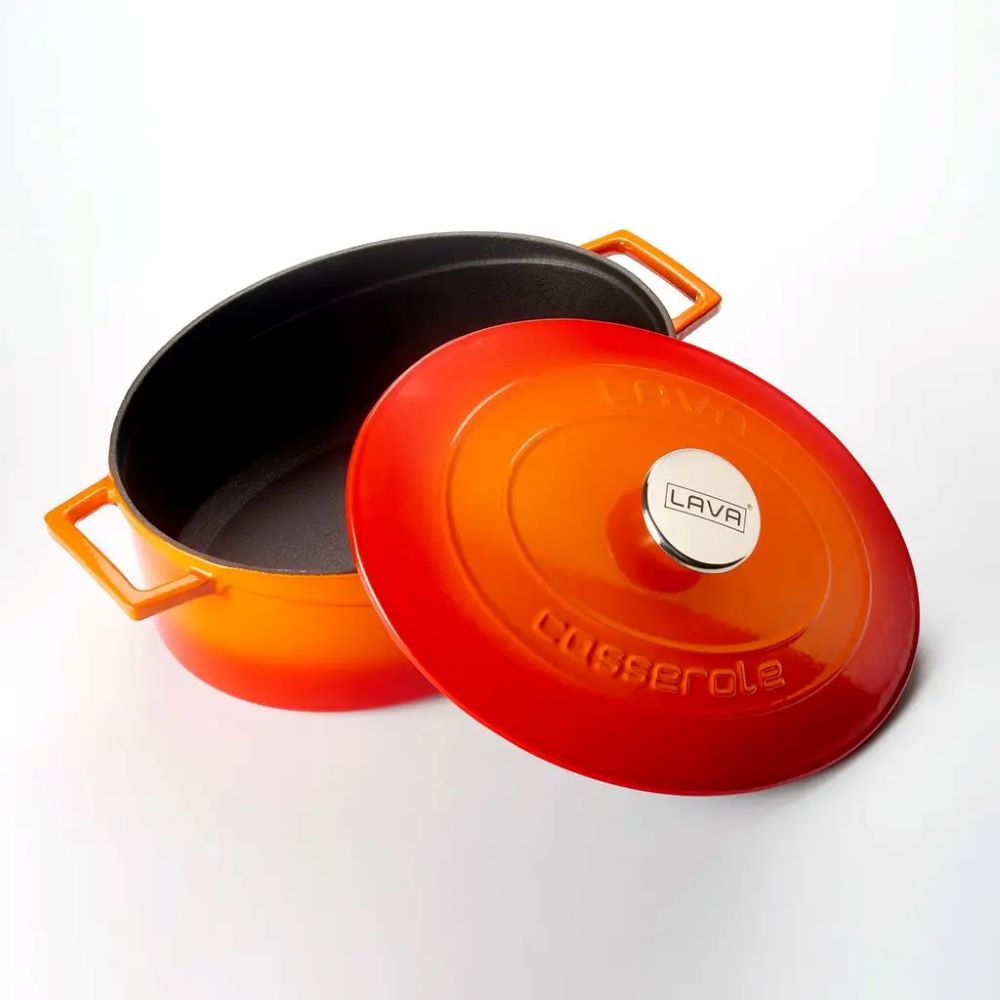 Стекловидная эмаль, материал, используемый для внешней отделки чугунной посуды Lava , получается путём распыления стеклянного порошка при температуре 750–850 °C. Стеклянный порошок прилипает к поверхности кастрюли, создавая защитный слой, который также способствует оптимальному распределению тепла.