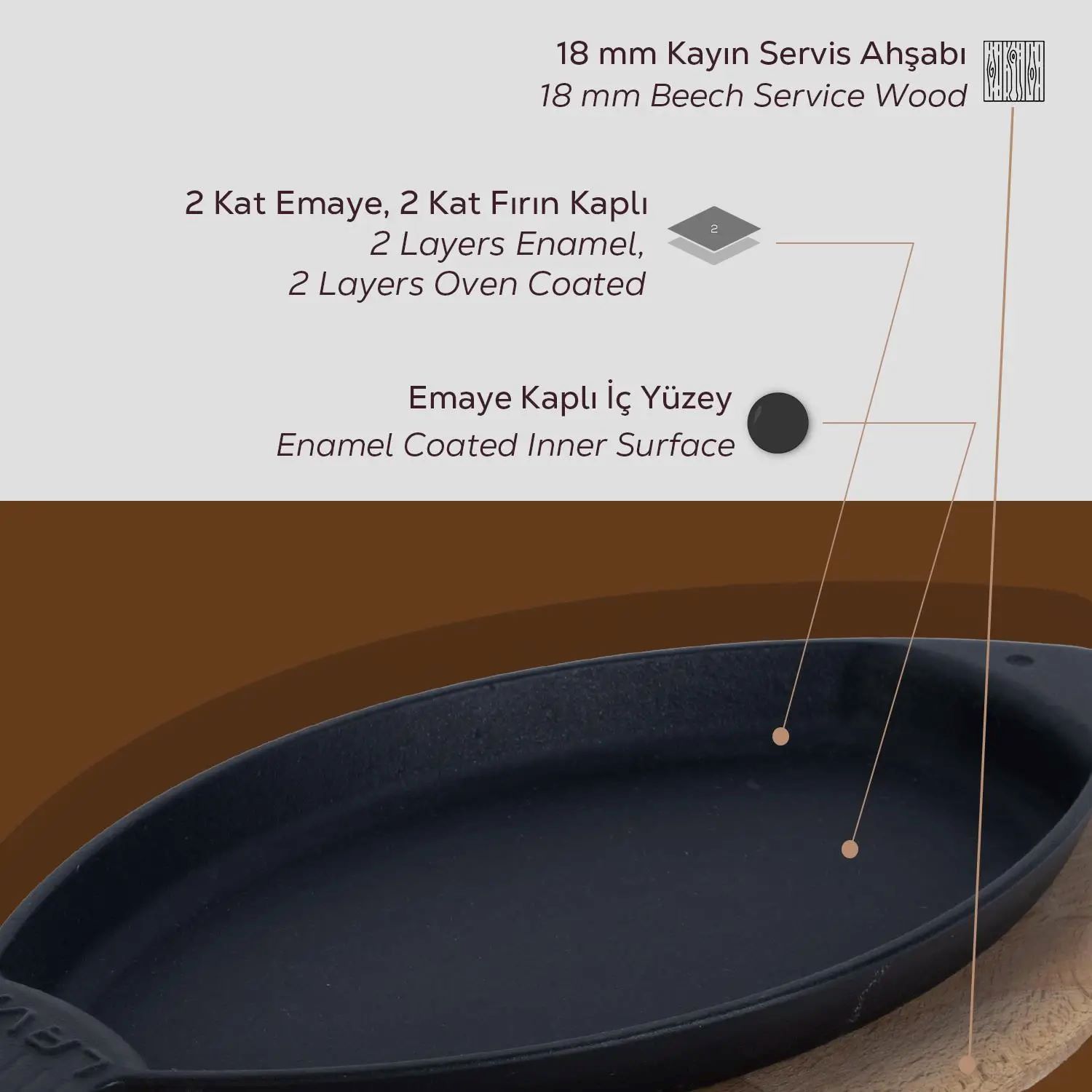 Steny vaničky sú hrubé 3,5 mm a zvnútra je výrobok potiahnutý jednou vrstvou čierneho smaltu , ktorý uľahčuje tvorbu nepriľnavého povrchu pri varení s tukom.
