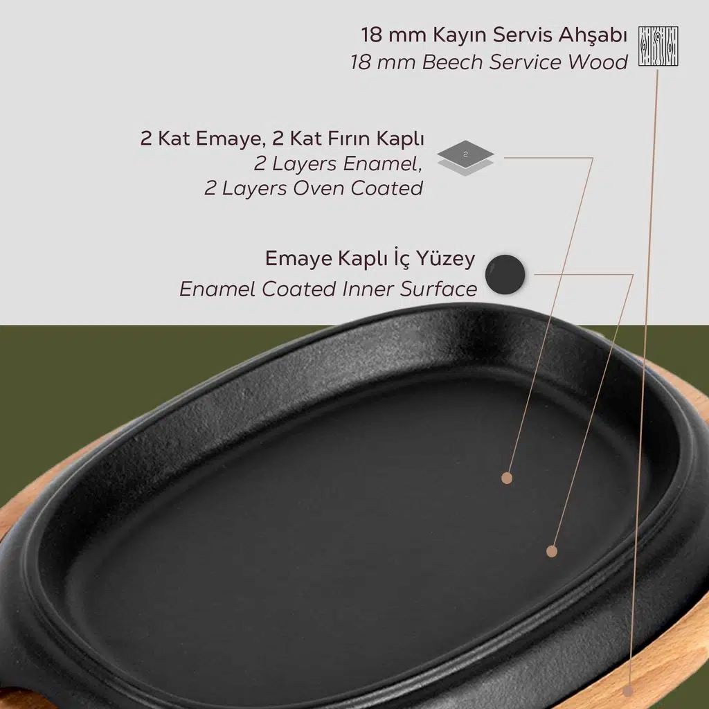 Oválna liatinová varná doska, rozmery 26 x 19 cm, s servírovacím tanierom z bukového dreva, značka Lava
