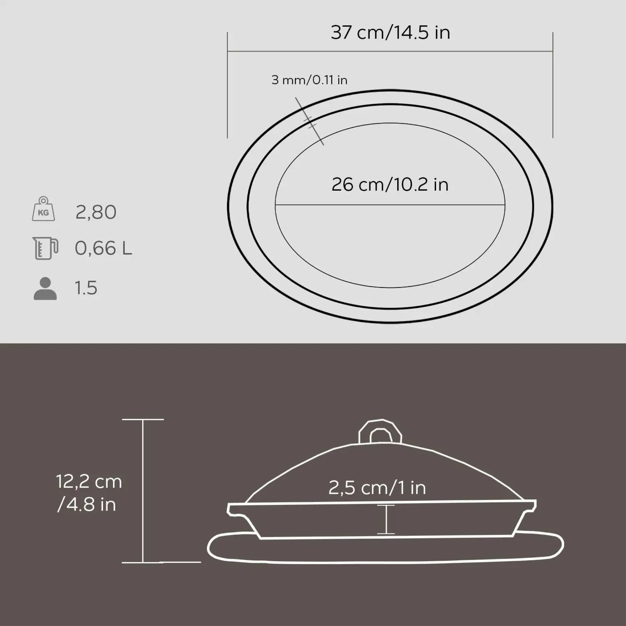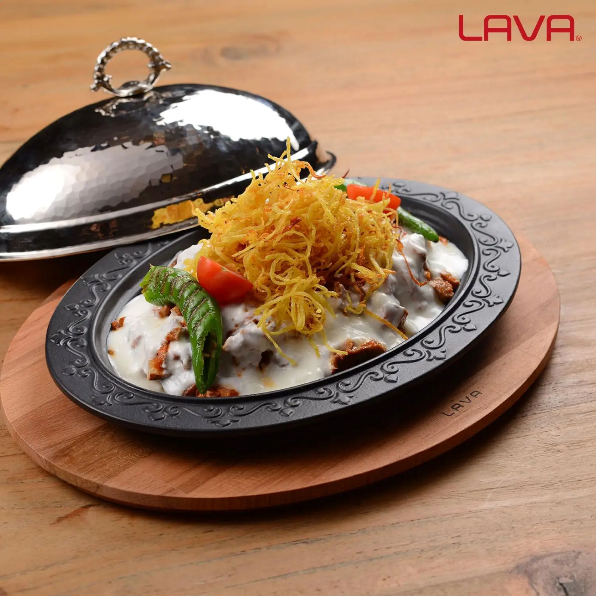 Oválny servírovací tanier s vekom, lávová značka, vyrobená z liatiny.
