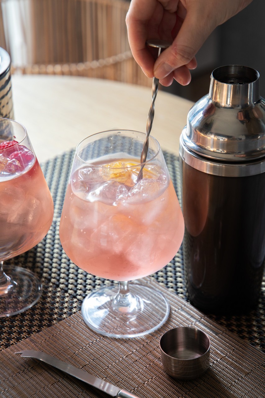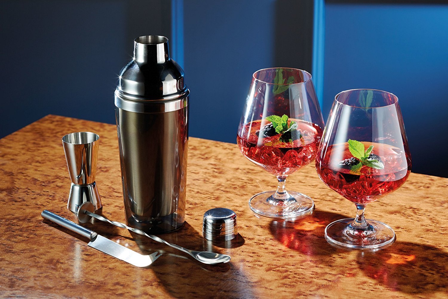 Set sadrži šejker od nerđajućeg čelika od 400 ml, dvostruko staklo za merenje od nerđajućeg čelika, kašiku za koktele od nerđajućeg čelika, nož od nerđajućeg čelika, knjižicu recepta za koktel i dve čaše za suvi džin kapaciteta 600 ml svaka.