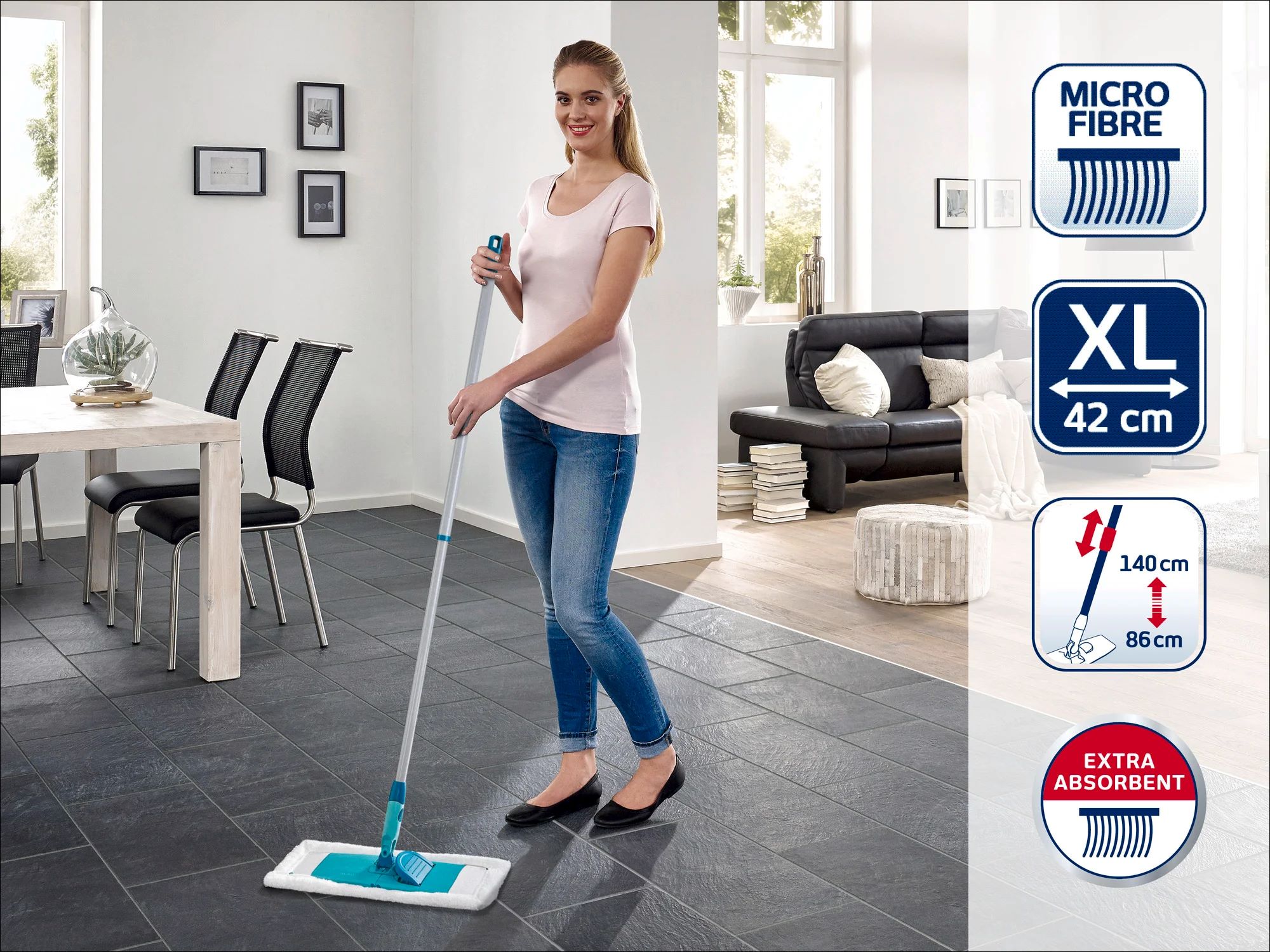 Den teleskopiska moppen Classic XL tar bort smuts från alla ytor: mikrofiberdynan rengör enkelt även vattenkänsliga golv. Samtidigt har Leifheit-dynan hög vattenabsorption, vilket gör den idealisk för rengöring av kakel och för att förhindra rester.