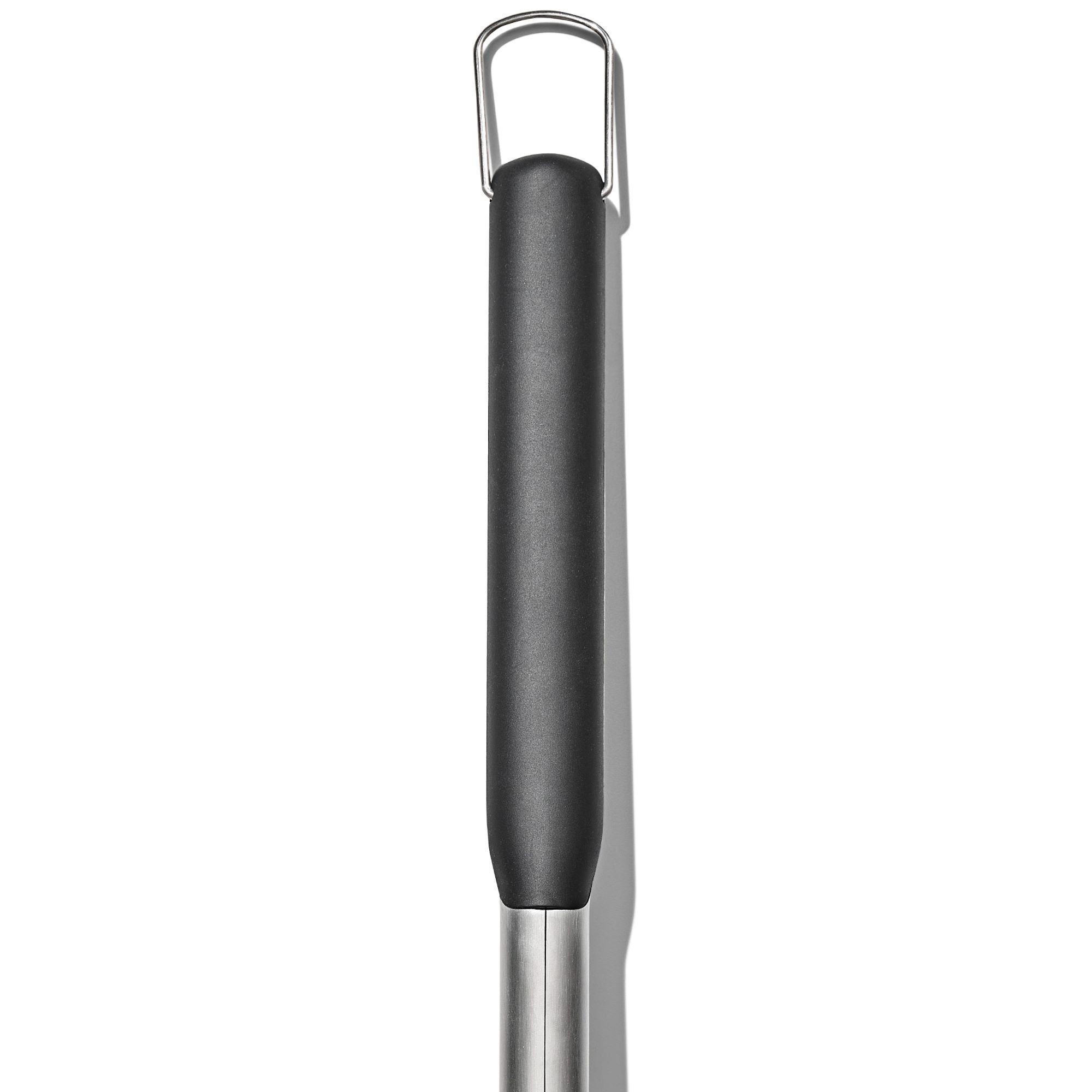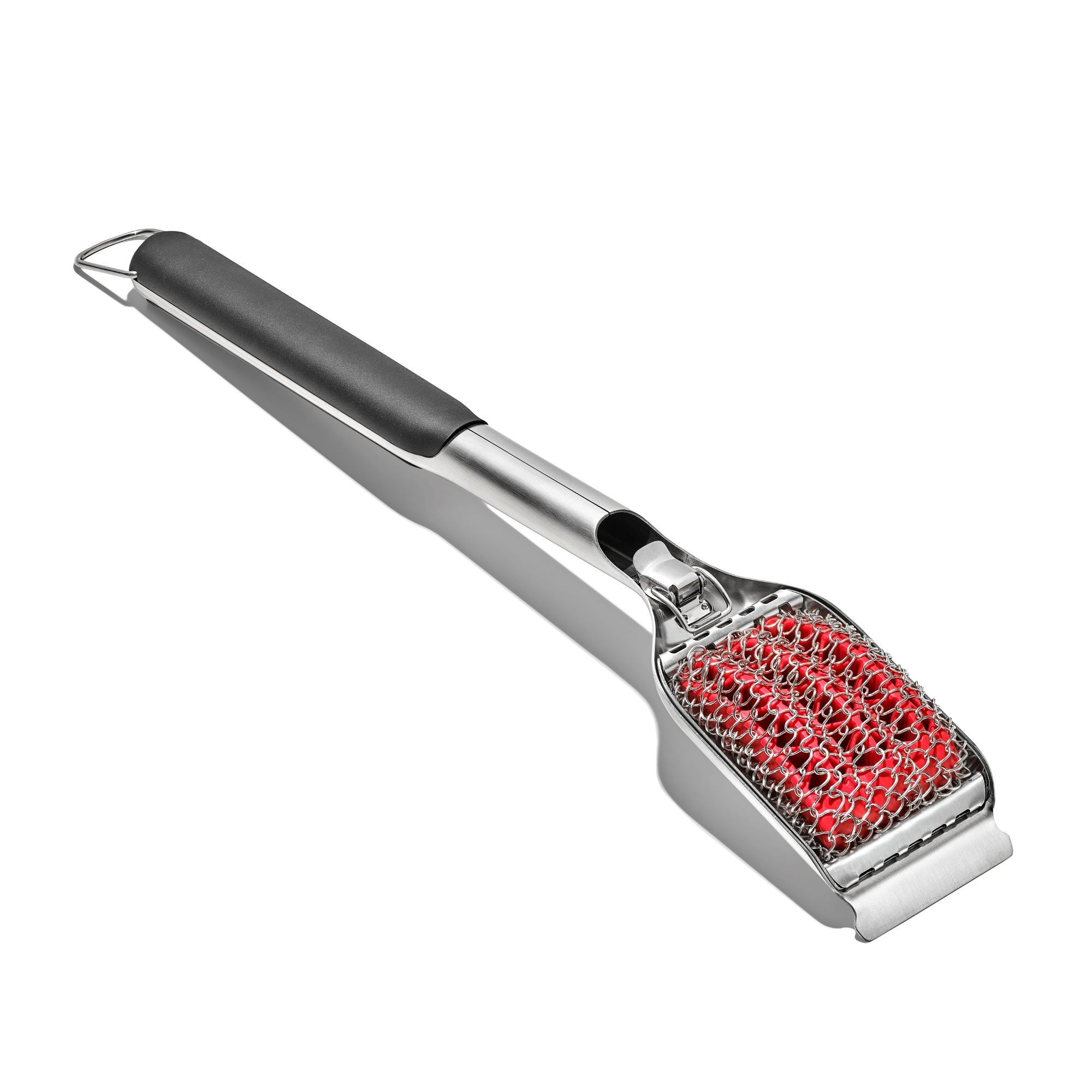Den inbyggda metallskrapan har utskärningar för rengöring av sidorna på grillgaller och skrapning av envisa rester. Den värmebeständiga kroppen och huvudet i rostfritt stål gör den lämplig för rengöring av heta ytor, medan det vinklade huvudet och det långa handtaget med mjukt grepp håller dina händer säkert borta från värmen. En upphängningsögla gör det enkelt att förvara den nära eller på grillen.