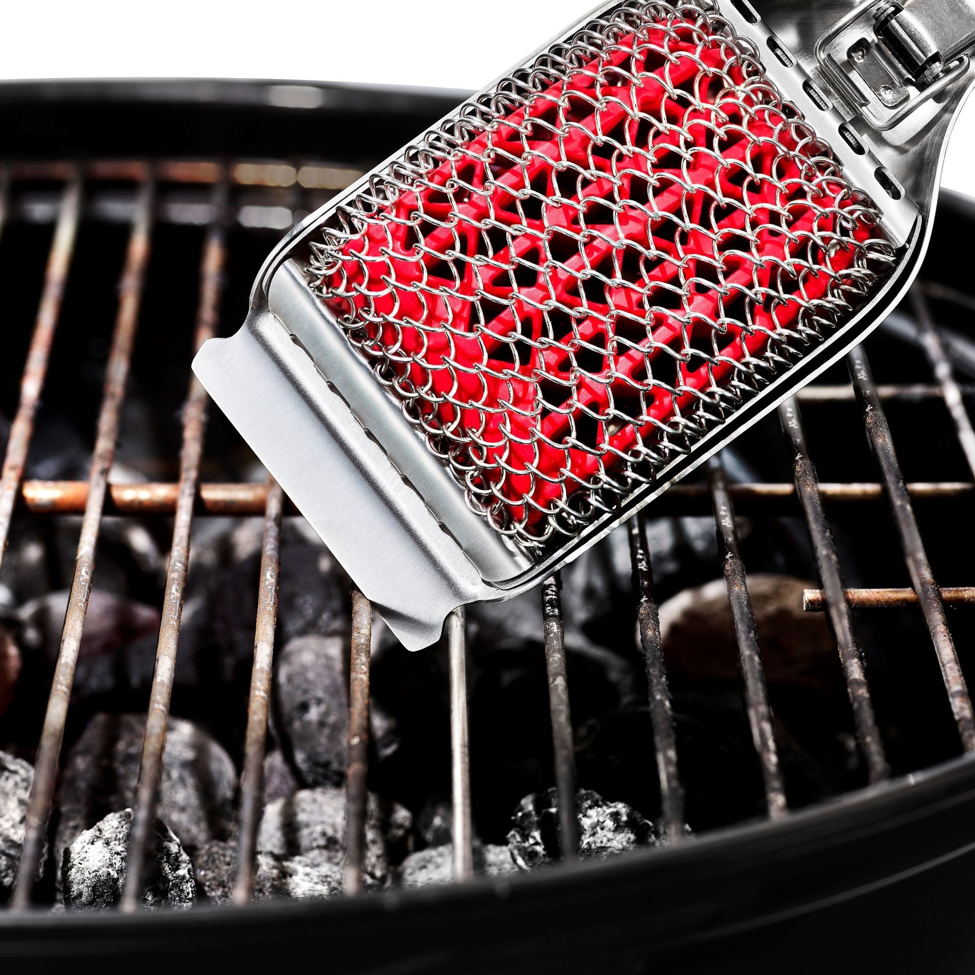 Det finns ingen anledning att vänta på att grillen ska svalna helt, de hållbara spiralerna i rostfritt stål arbetar tillsammans med flexibel silikon för att enkelt skrubba varma grillgaller. Den borstfria designen säkerställer noggrann borttagning av rester.