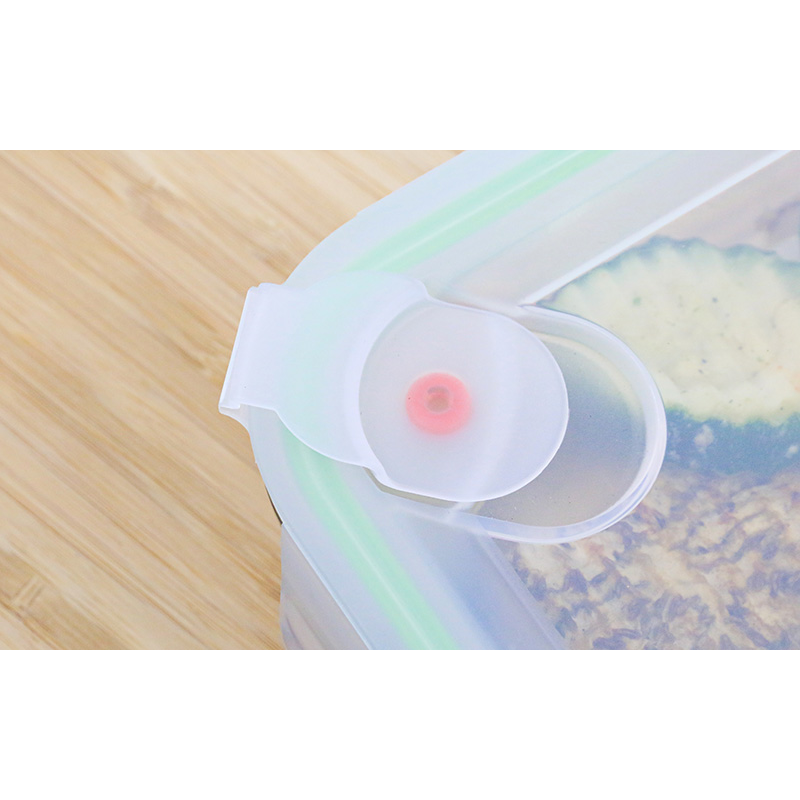 Locket av plast är försett med ventil och packning av silikon, vilket gör det möjligt att få en lufttät stängning, förhindra spill av vätskor och hålla näringsvärdena och färskheten hos maten under en längre tid.