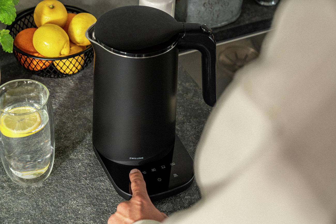 Vattenkokaren "Enfinigy Pro" tillverkad av Zwilling, utrustad med 7 förinställda program och en kapacitet på 1 L.