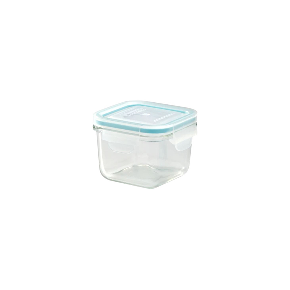 Kapaklı Kare Glasslock gıda kabı , kapasite 210 ml, boyutları 8,2 x 8,2 x 5,7 cm, temperli camdan yapılmış, -20°C ile +120°C arasındaki sıcaklıklara dayanıklı.