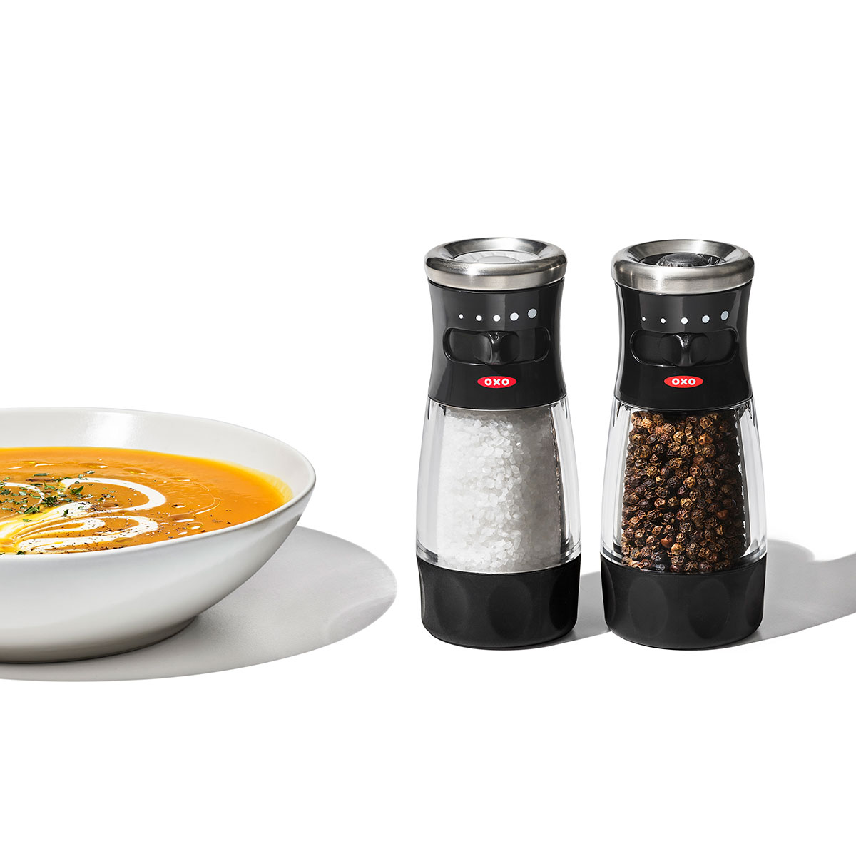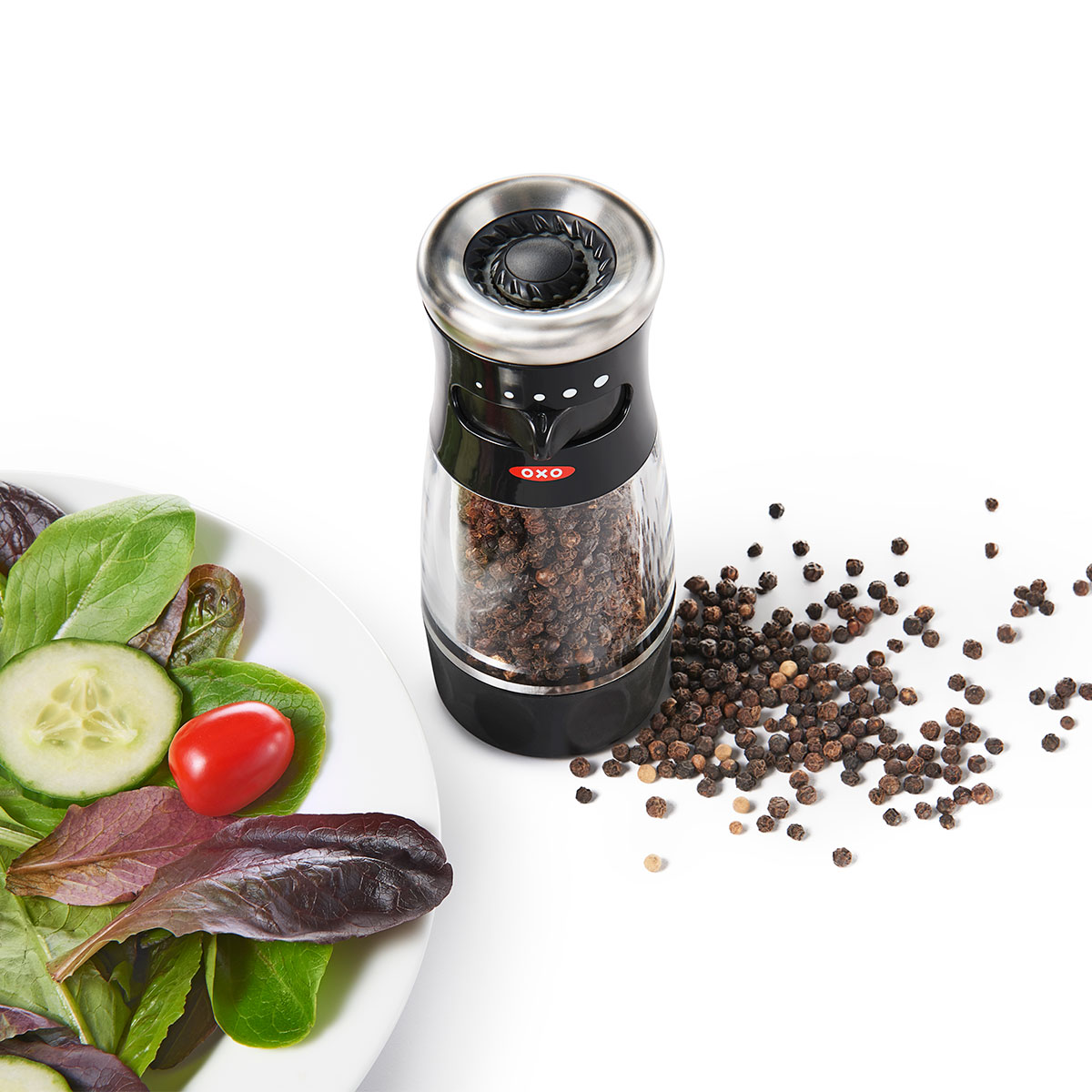 Zarif OXO SoftWorks karabiber öğütücü , herhangi bir mutfak veya yemek masası için mükemmel bir aksesuardır. Bu manuel karabiber öğütücü, paslanmaz çelik vurgulara ve şeffaf akrilik gövdeye sahiptir ve yeniden doldurma zamanının geldiğini kolayca görmenizi sağlar.