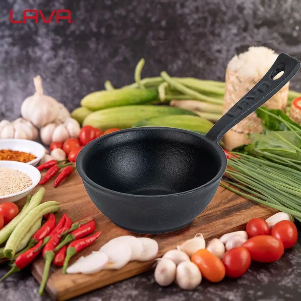 Dökme demirden yapılmış, çapı 7 cm ve yüksekliği 6,8 cm, kapasitesi 100 ml olan Lava, tarafından üretilen sufle veya sos için mini tencere.